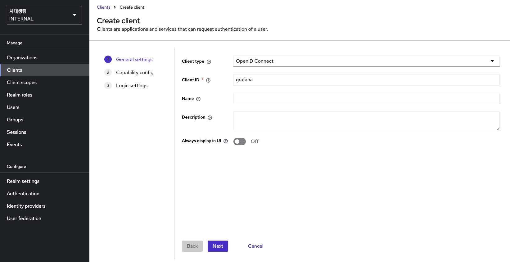 다음과 같이 시대생팀의 Internal keycloak realm에서 grafana라는 client를 검색하면 나오는 것을 확인할 수 있다. 이런 식으로 Client를 등록하는 것을 OIDC 용어로는 RP/Relying Party라고 한다. 이와 같이 Client ID를 생성하고, Type을 OpenID Connect로 지정해준다.
