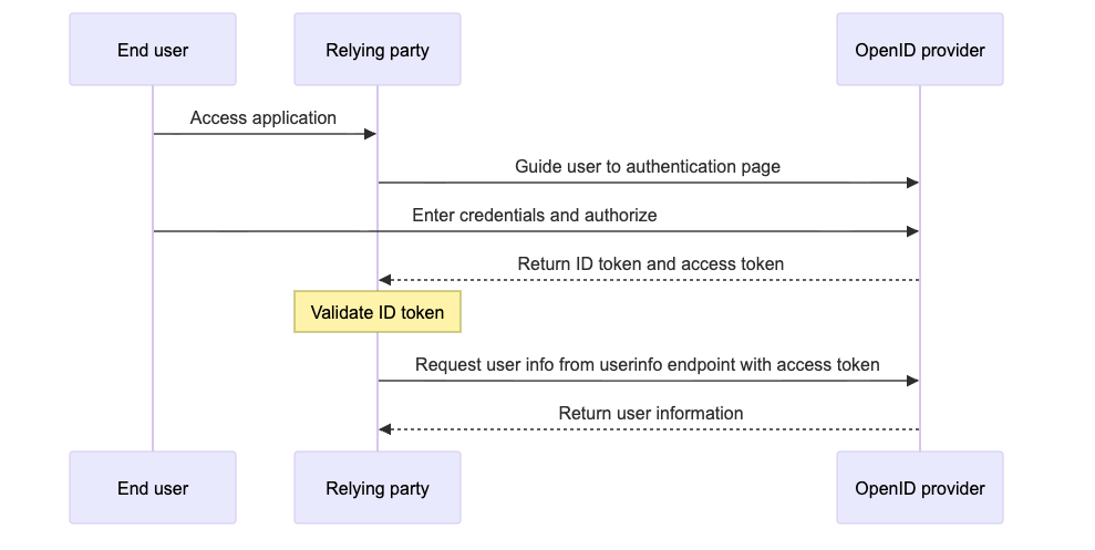 OIDC는 인가만 제공하는 OAuth와는 다르게 추가적으로 인증을 제공하며, 인증/인가에 대한 가장 일반적인 시나리오를 제공한다. 우리가 생각하는 일반적인 다른 플랫폼을 통한 로그인은 OIDC + OAuth 2.0이 섞여 있는 것이라고 볼 수 있다. 일반적으로 OIDC를 사용하는 프로세스는 아래와 같이 그려진다.