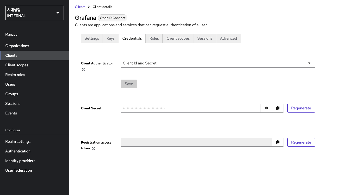 이렇게 Client Authentication 설정을 On으로 설정하고 나서, clinet를 생성하면 성공적으로 RP가 생성된다. 여기에서 끝나는 것이 아니라, 다음으로는 Grafana 대시보드를 띄우는 과정에서 해당 OIDC를 정상적으로 활용할 수 있도록 등록해줘야 한다.