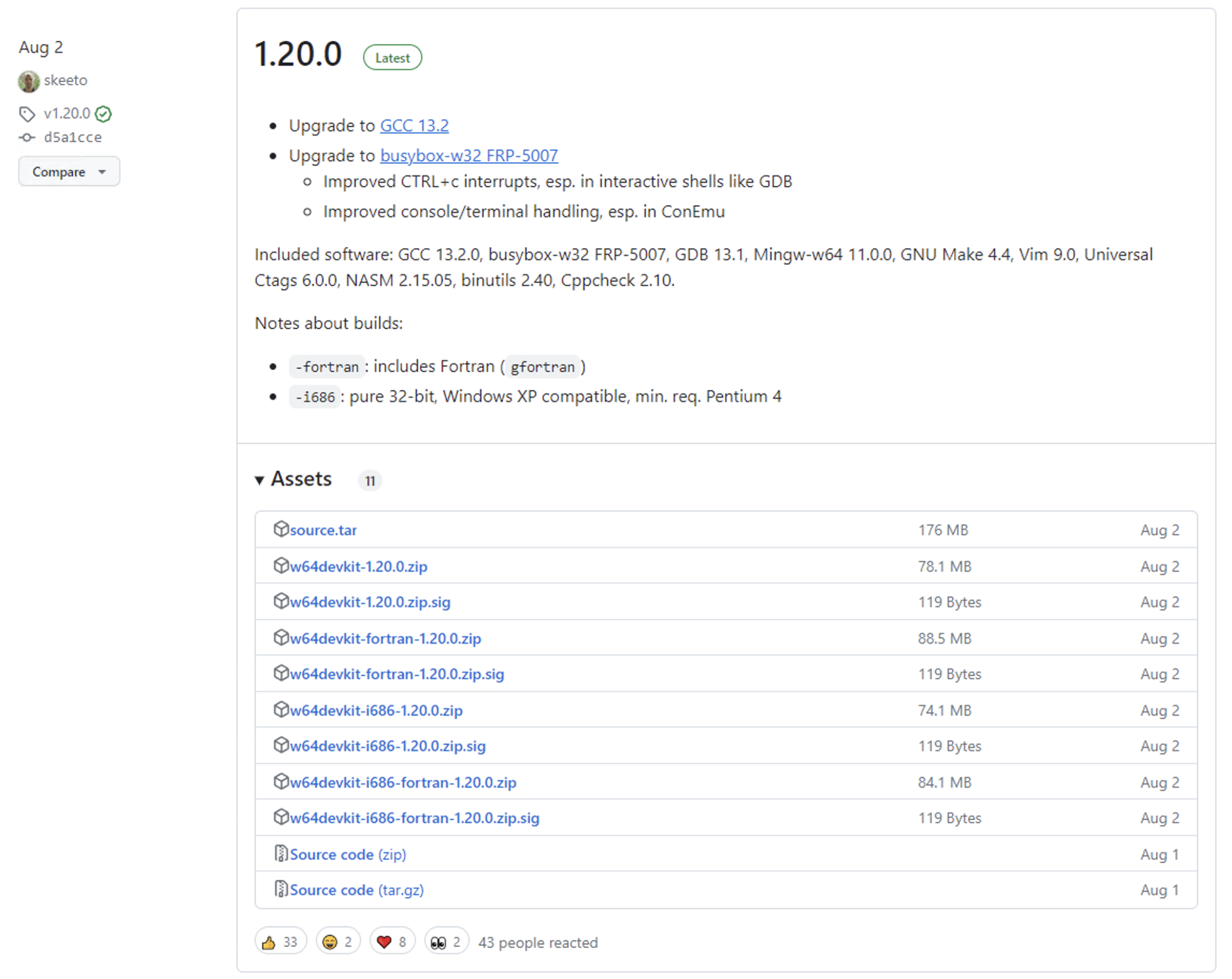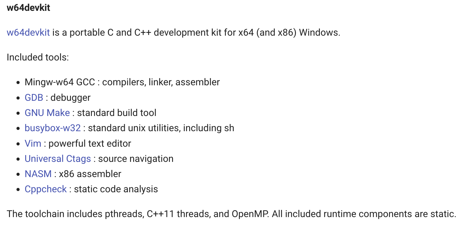 윈도우를 사용하는 경우에는 MinGW를 이용해야 한다. MinGW(Minimalist GNU for Windows)는 이름 그대로 윈도우에서 사용할 수 있는 MinGW를 의미한다. 다음 사이트에 방문하여 w64devkit을 다운로드한다. w64devkit을 설치하는 이유는 UNIX계열의 유틸리티를 사용할 수 있게 하기 위함이다. 해당 키트는 GCC 외에도 Vim이나 busybox 등의 유틸리티를 제공한다.