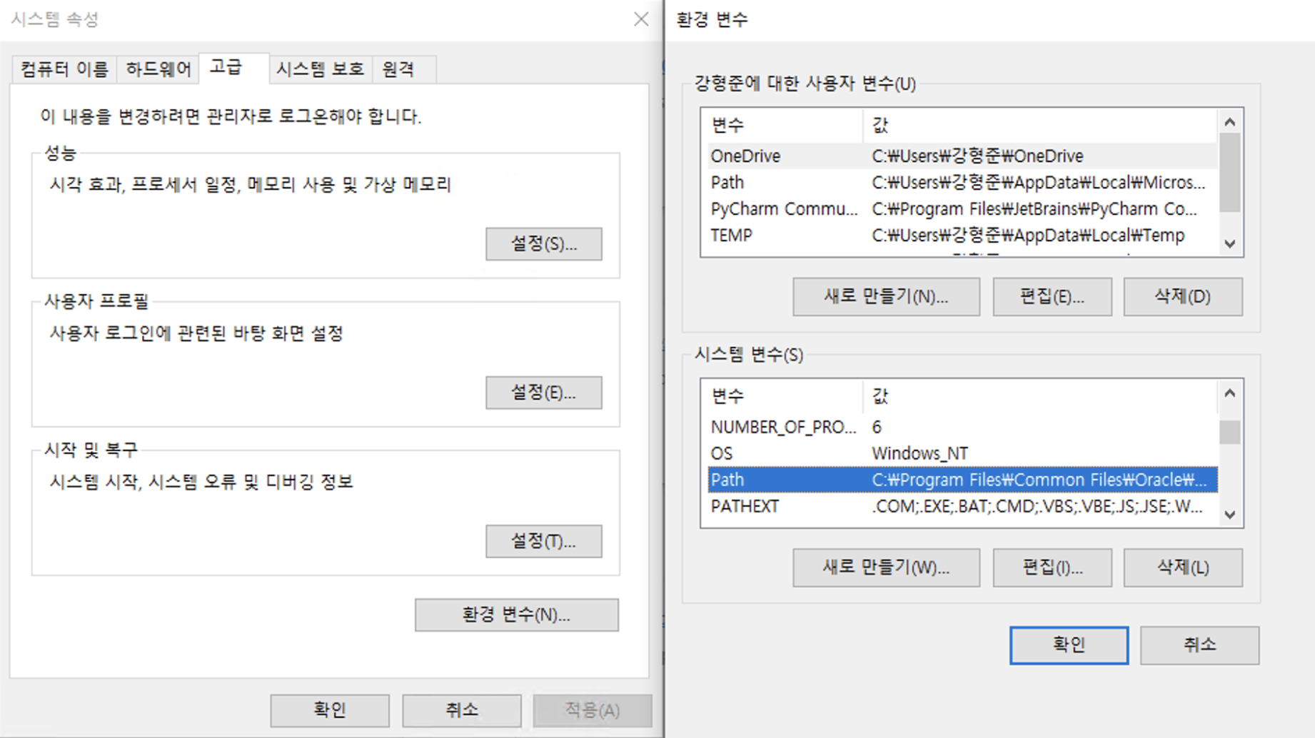 왼쪽의 창에서 환경 변수(N)... 버튼을 누르면 오른쪽 창이 뜨는데, 시스템 변수(S)에서의 Path를 누른다.