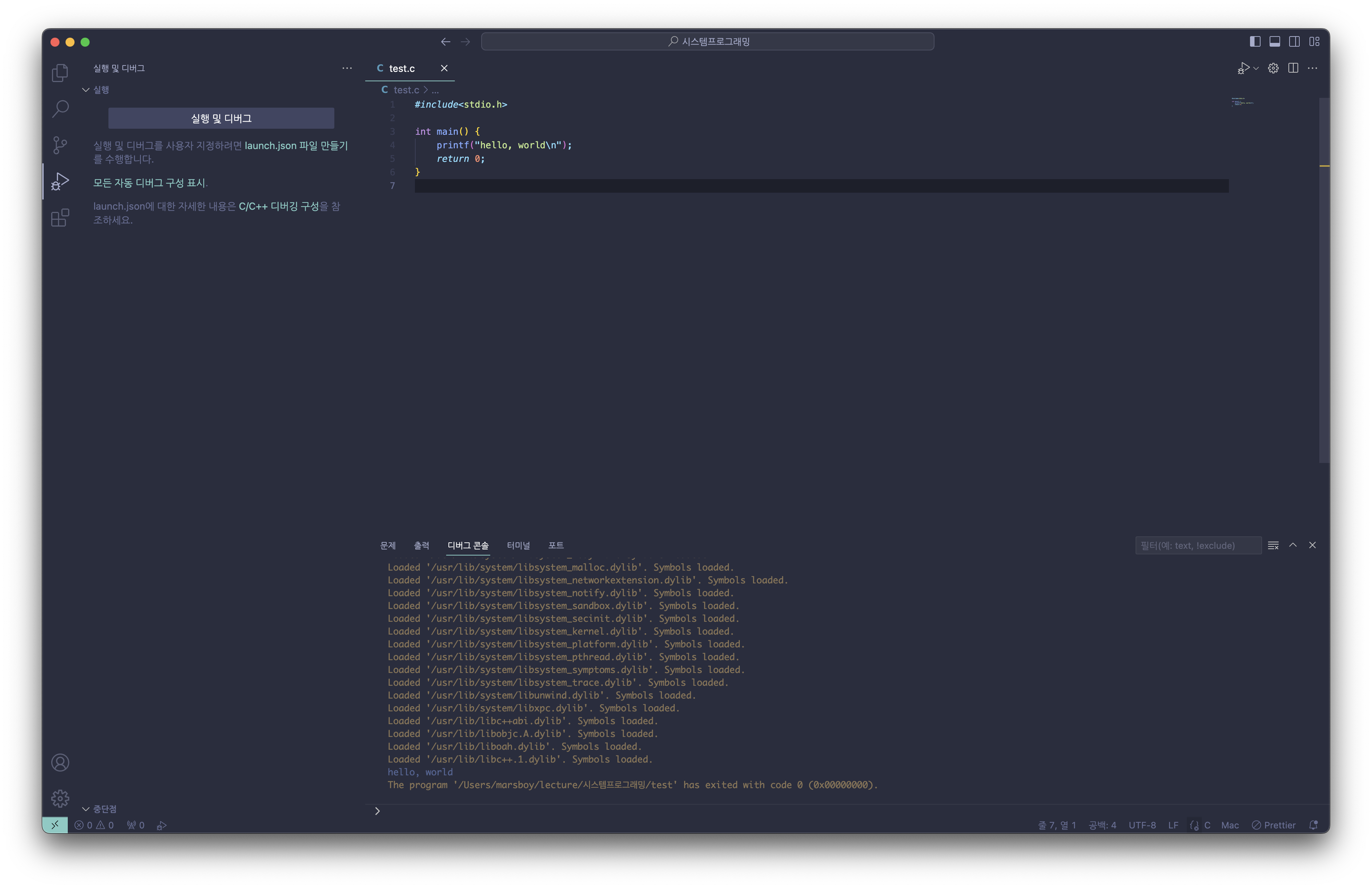 이렇게 C를 컴파일 및 실행할 수 있는 환경은 갖추었다. 검은 터미널 화면에서 C 코드를 짤 수는 없을 노릇이 아닌가? 이제 vscode를 연결해 보자.