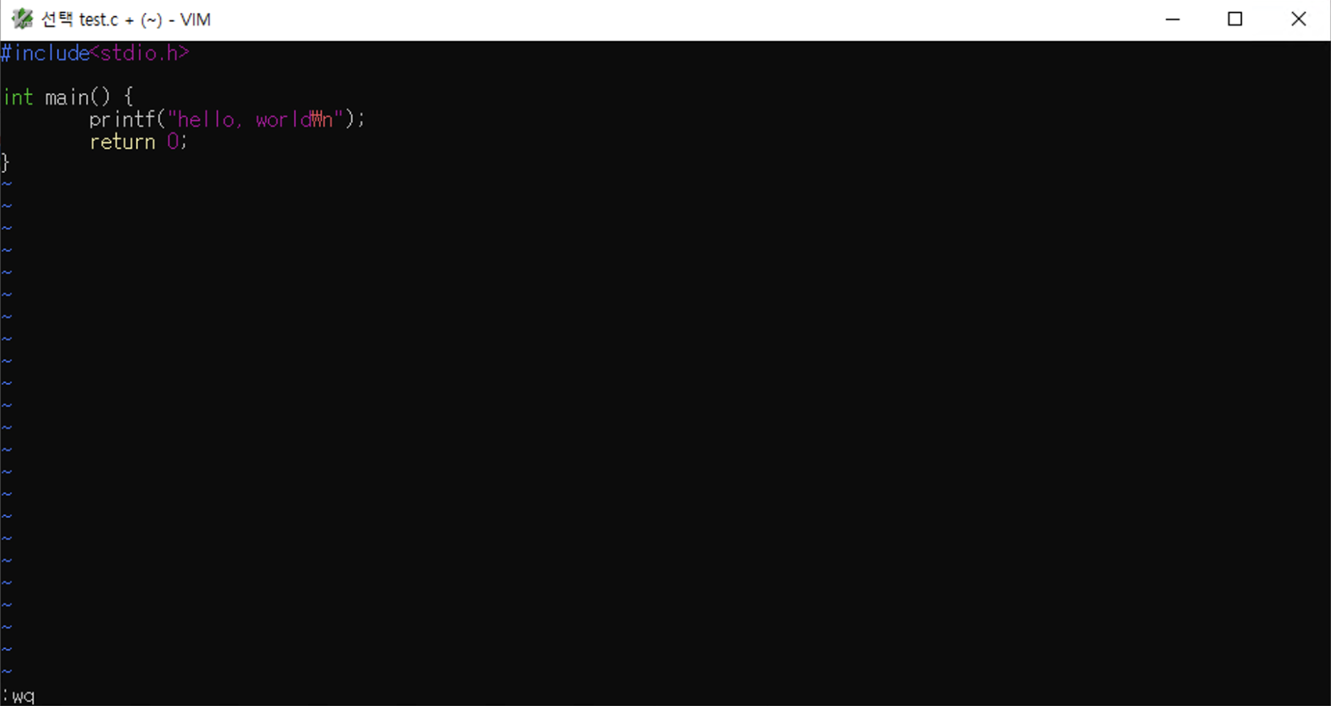 자, 이제 gcc나 vi와 같은 명령어를 사용할 수 있게 되었다. 원하는 디렉터리에서 vi test.c 명령어를 통해 test.c 파일을 편집한다. 위와 같이 파일의 내용을 입력하고 :wq를 통해서 파일을 저장하고 종료한다. 그 후 윈도우 기준으로 다음 명령어를 통해서 파일을 실행시킬 수 있다.