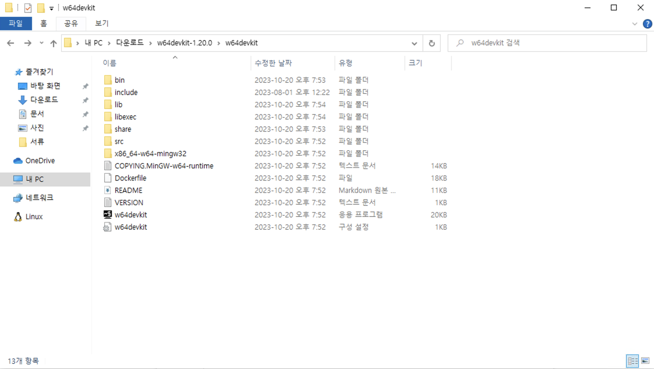 따라서 해당 폴더(w64devkit)의 위치를 Program Files로 옮겨준다. 그렇다면 bin 폴더의 위치는 C:₩Program Files₩w64devkit₩bin이 될 것이다.