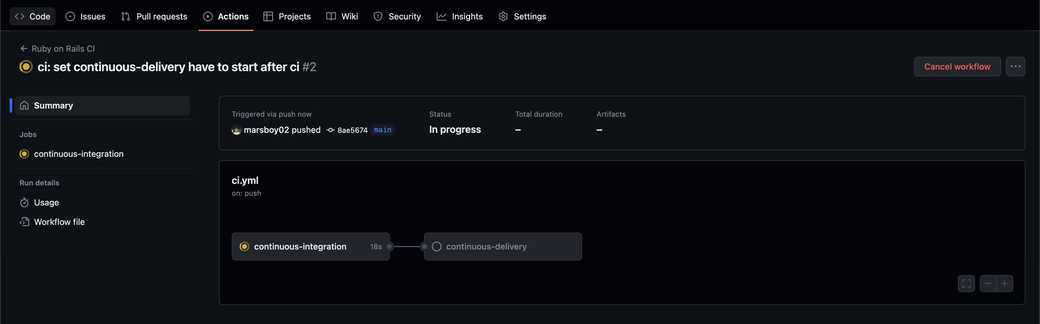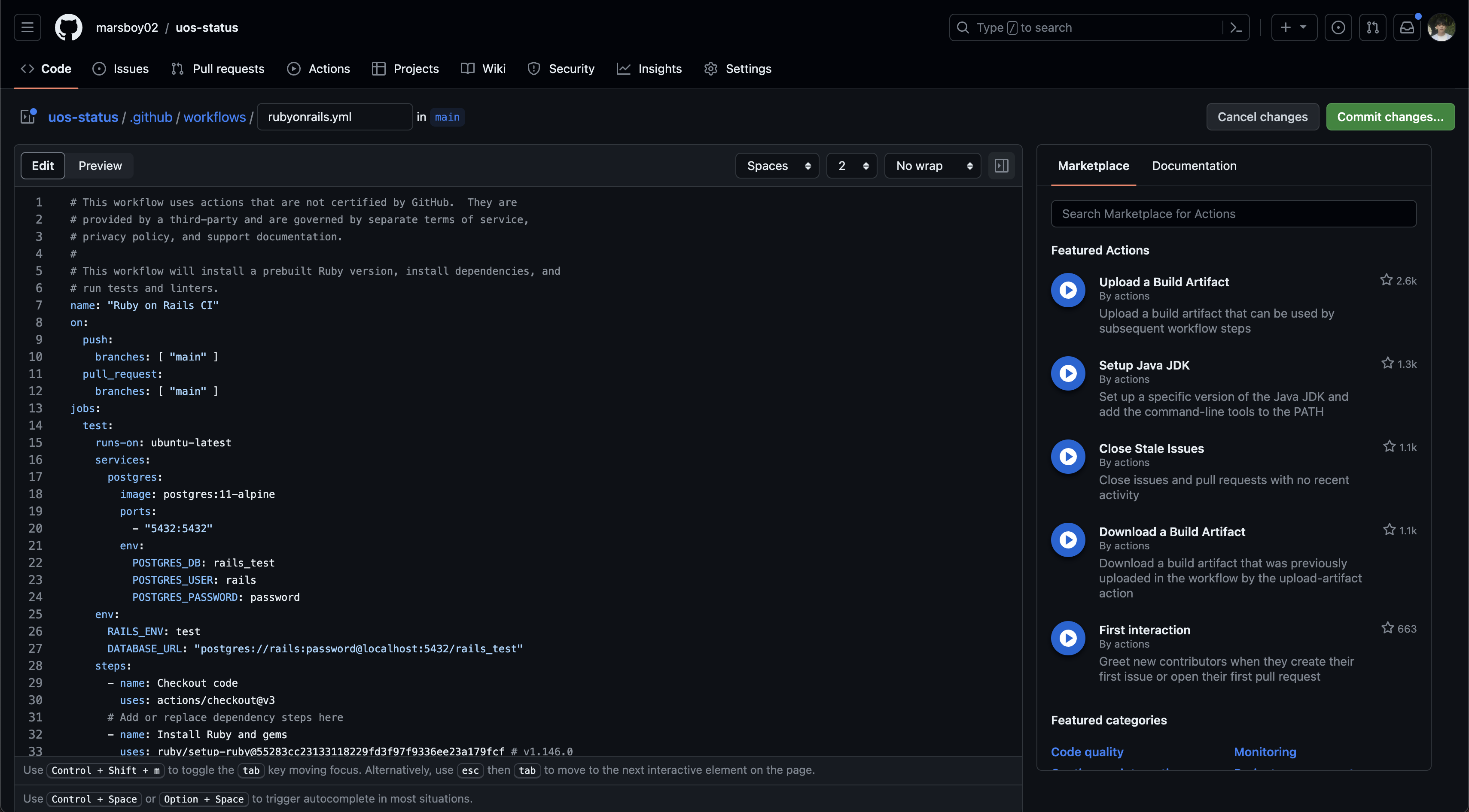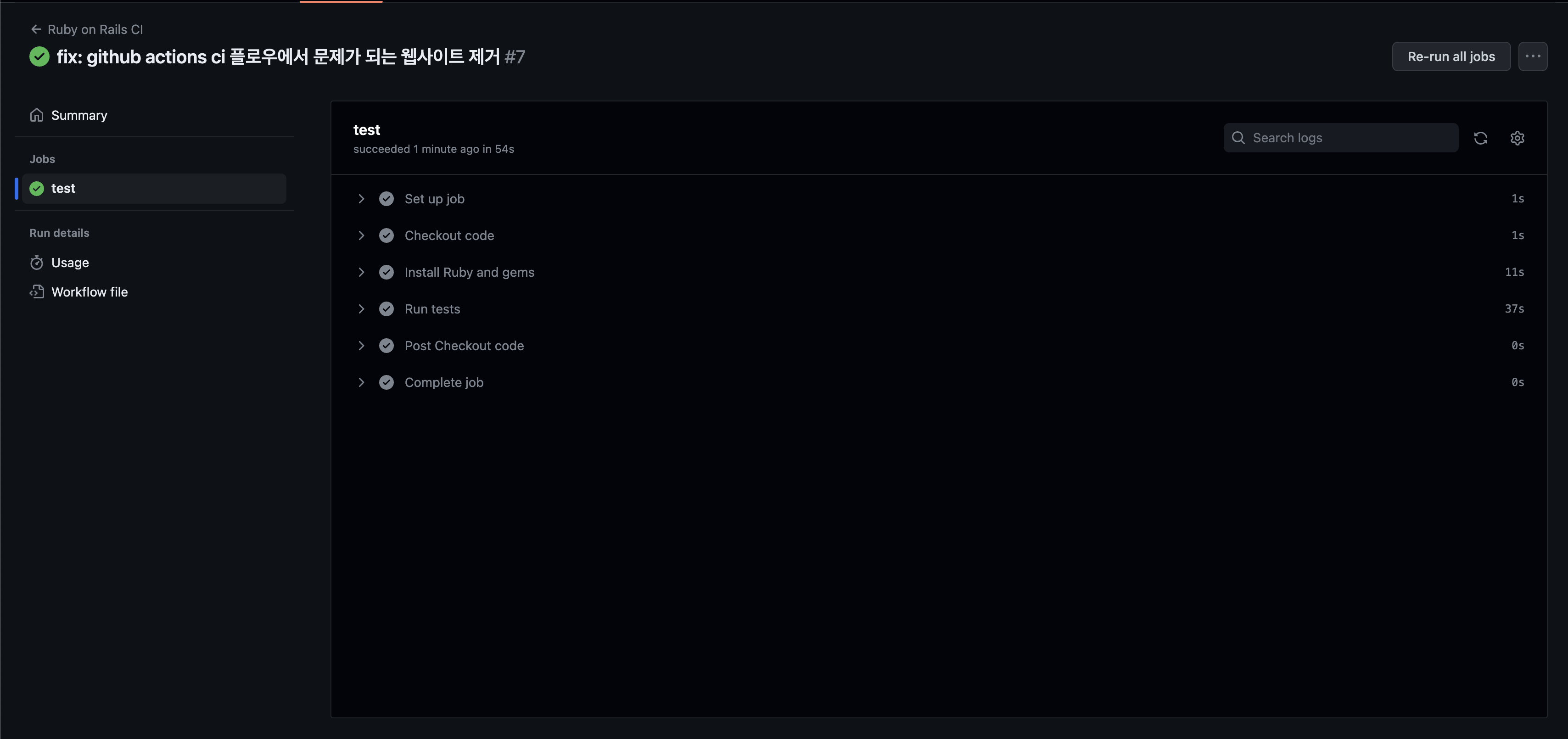 위 스크립트를 기본적은 스키마이기 때문에 그대로 가져다 쓰지 말고, 개인의 프로젝트에 맞게 바꿔서 써야 한다. 레일즈가 아닌 다른 프로젝트의 CI 파이프라인을 만드는 경우에는 알아서 깃허브에서 맞는 configure를 추천해 준다. 현재 이 프로젝트는 일단 데이터베이스를 붙이지 않았고, lint를 사용하지 않는다. 따라서 기존의 yml 파일을 다듬어 다음의 구조만 남기도록 한다.