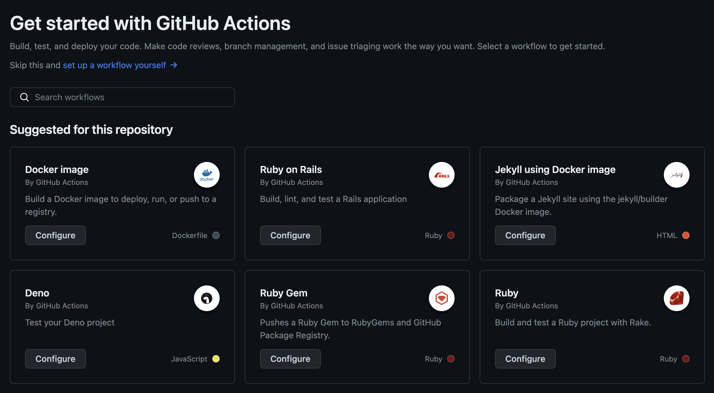 Github에서 레포지토리의 상태를 파악하고 다양한 configure들을 제시해 준다. 대충 설명을 읽어보니 Docker image와 Ruby on Rails의 Configure가 필요해 보인다.