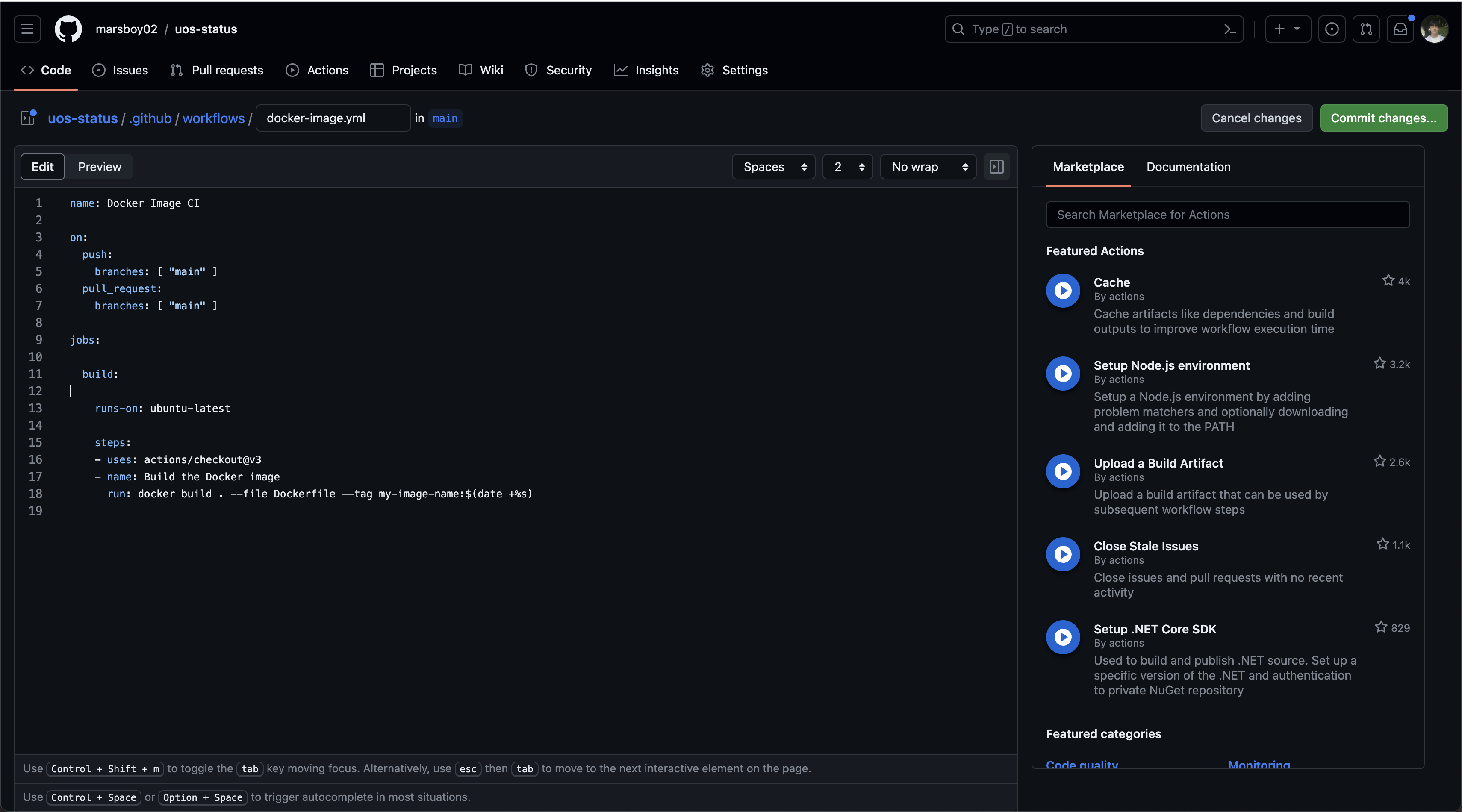위 과정만 실행한다고 하면 CI 파일은 다음과 같이 정의할 수 있다. 다음과 같이 yml 파일을 작성한 후 우측 상단에 있는 Commit change.. 버튼을 누르면 알아서 .github/workflows 에 CI 파일이 추가된다.