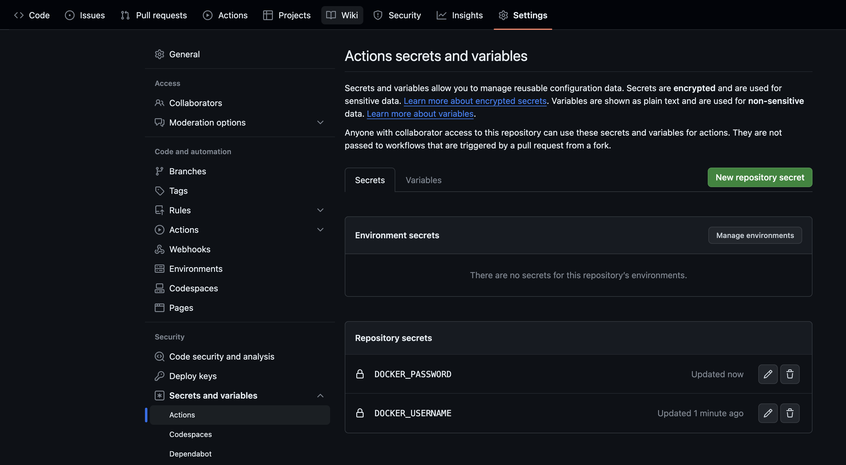 도커 허브에 업로드하는 과정은 로그인을 필요로 하기 때문에 Settings - Secrets and variables에 DOCKER_PASSWORD 및 DOCKER_USERNAME을 업로드한다.