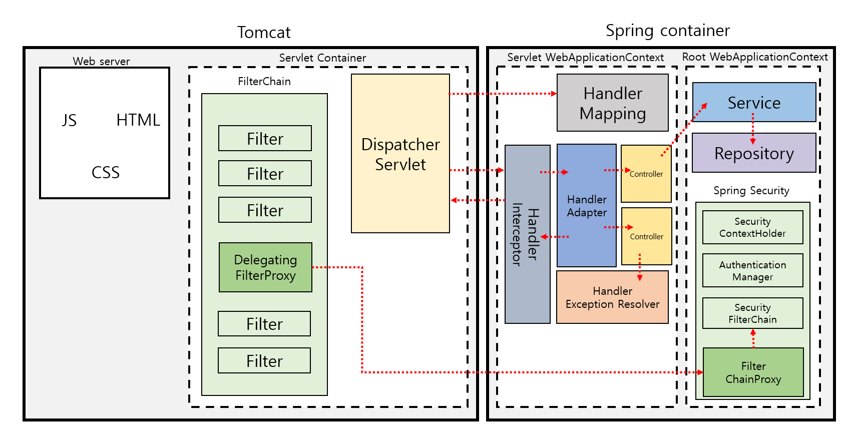 위 그림은 Spring 서버에 요청을 보내면 어떤 식으로 요청이 서버에 전달되는지 간단하게 나타낸 구조도다. 여기서 중요한 포인트는 왼쪽의 Tomcat의 Web Server는 HTML, CSS, JS와 같은 정적인 리소스들을 제공하고, 오른쪽의 Spring Container라는 Application Server는 Controller, Service, Repository로 나누어져 복잡한 비즈니스 로직을 처리하는 작업을 한다.