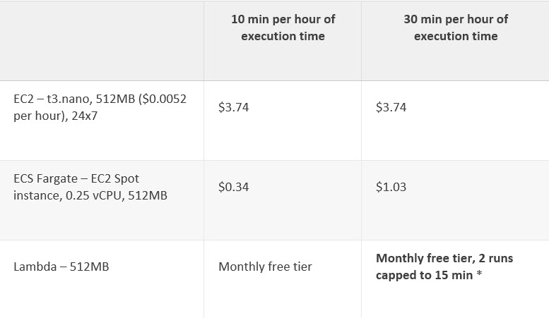 위 게시글의 주요한 요지는 스크래퍼를 구현하는 경우에는 Lambda를 쓰라는 것인데, 위 이미지를 보면 알겠지만, 람다는 15분 이내의 작업을 실행시킬 수 있으며 컴퓨팅 리소스를 굉장히 적게 사용한다는 것이었다. 즉, 간단한 스크립트를 돌리는 정도는 람다로 처리하는 것이 좋고, 스크래핑의 역할을 서버에 위임하거나, 스크래핑을 위한 서버를 만드는 것은 비효율적이기 때문에 이를 참고해서 아키텍처를 구현하기 시작했다.