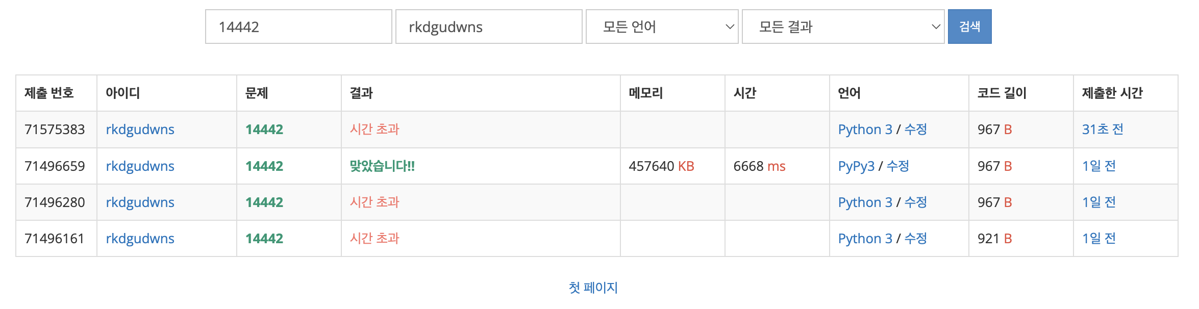 보통 Python3로 풀리는 문제를 PyPy3 런타임으로 실행시키면 메모리와 시간을 보다 적게 사용할 것이다. 그런데 위와 같은 문제는 똑같은 코드를 Python3 런타임을 사용하면 시간 초과가 나고, PyPy3 런타임을 사용하면 문제가 풀린다! 이러한 경우가 있을 수 있기 때문에 정말 내 코드가 이럴리 없다... 한다면 PyPy3 런타임을 사용해 보는 것을 추천한다.