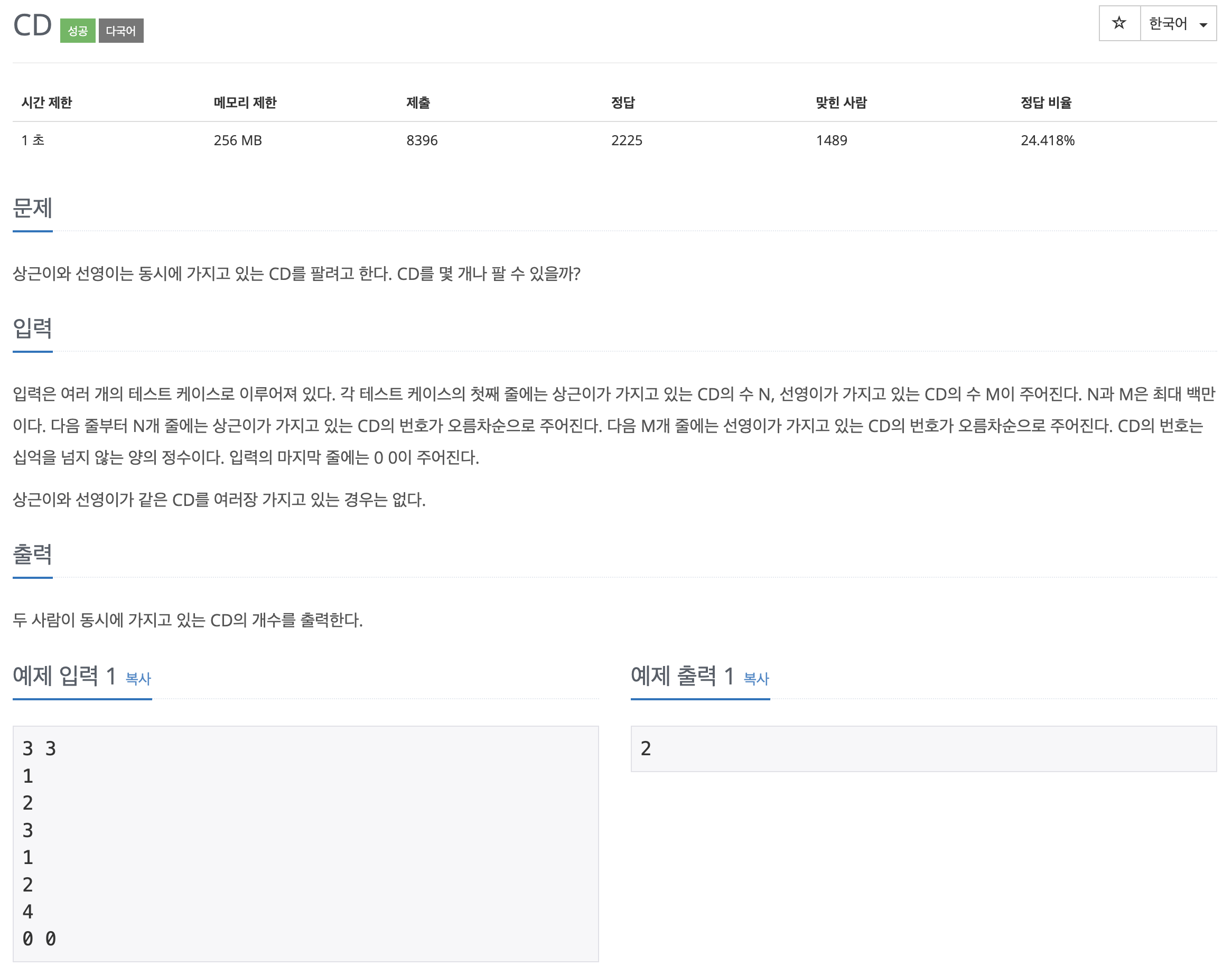 얼핏 보면 간단하게 풀 수 있을 것 같아 보인다. 상근이와 선영이가 가진 CD 번호를 비교해서 같은 게 몇개인 지 알 수 있지 않을까, 이중 포문을 써서 비교하면 되지 않을까?