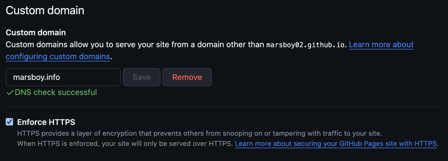 깃허브 레포지토리({USERNAME}.github.io)에서 Setting - Pages를 들어가 보자. 해당 페이지에서는 custom domain을 설정하는 항목이 있는데, https 체크박스를 눌러주고 본인의 도메인을 Save 해준다. 이렇게 설정하고 나서 끝이 아니다. 도메인 네임 호스팅 사이트에서도 설정을 해두어야 한다.