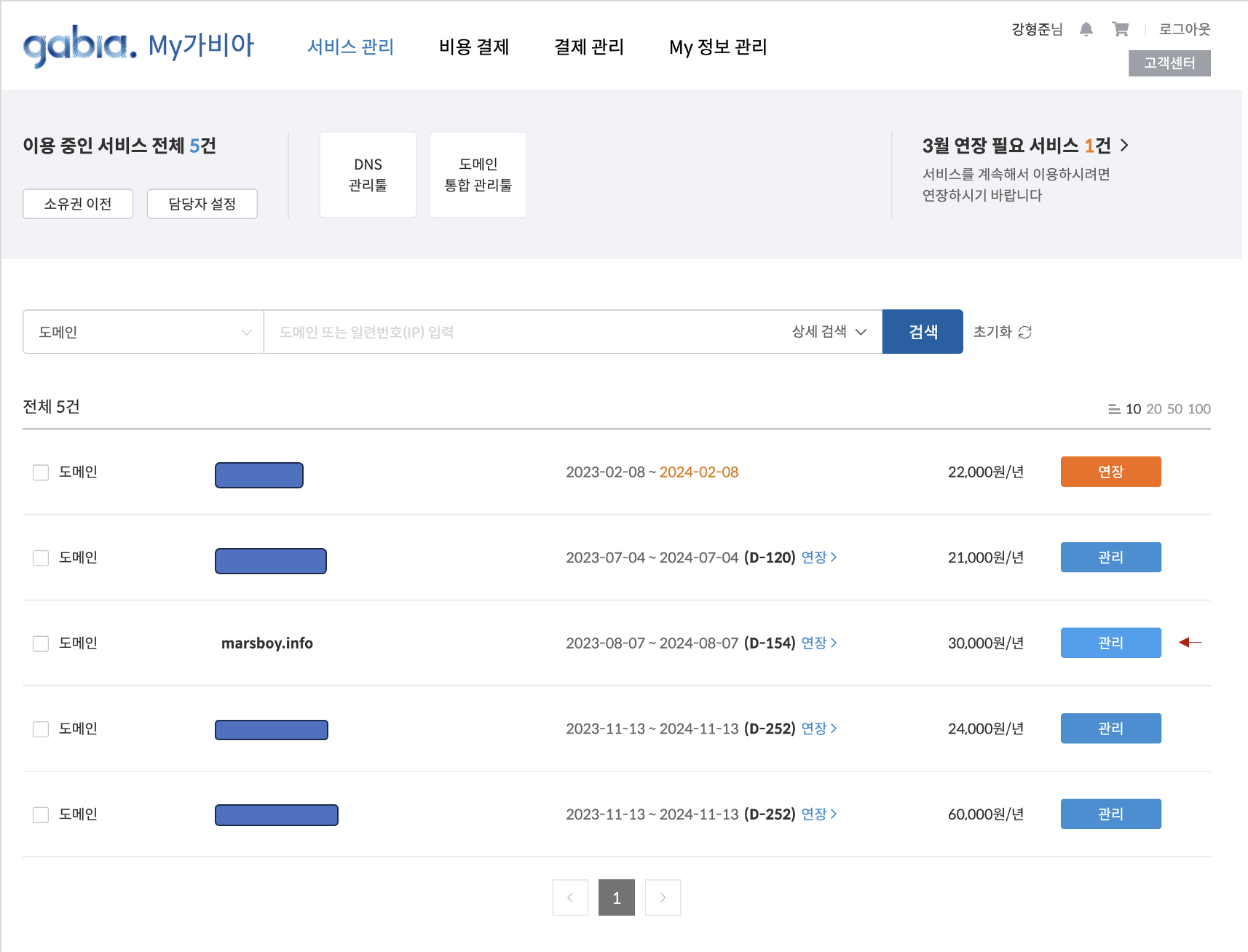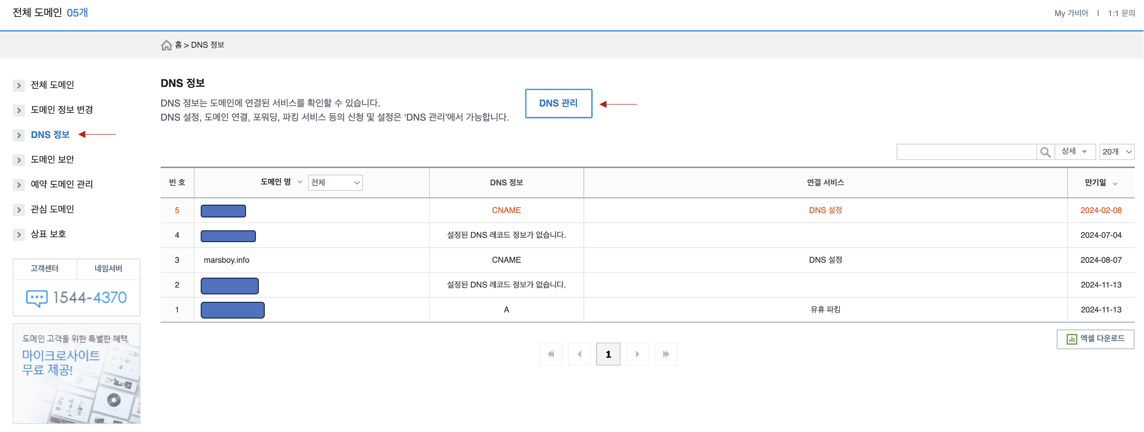 위 페이지에서 관리 버튼을 통해서 원하는 도메인 네임의 관리 페이지에 들어간다.
