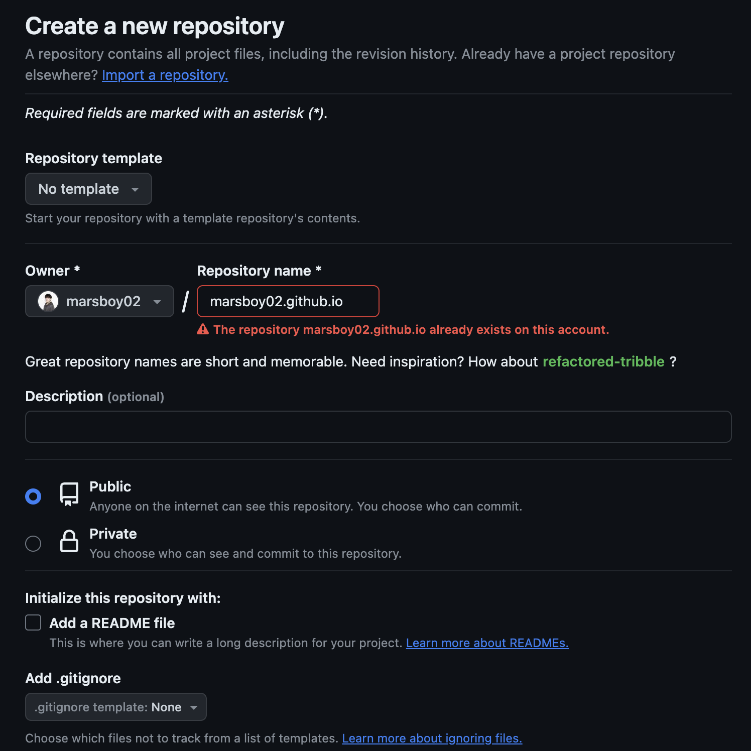 이렇게 레포지토리를 만들 수 있다. 필자는 이미 똑같은 레포지토리가 있어 빨간 경고문이 떴지만, 없는 사람은 위와 같이 만들어주면 된다. 그 다음 터미널에서 CLI를 통해서 index.html 파일을 추가해 보자.