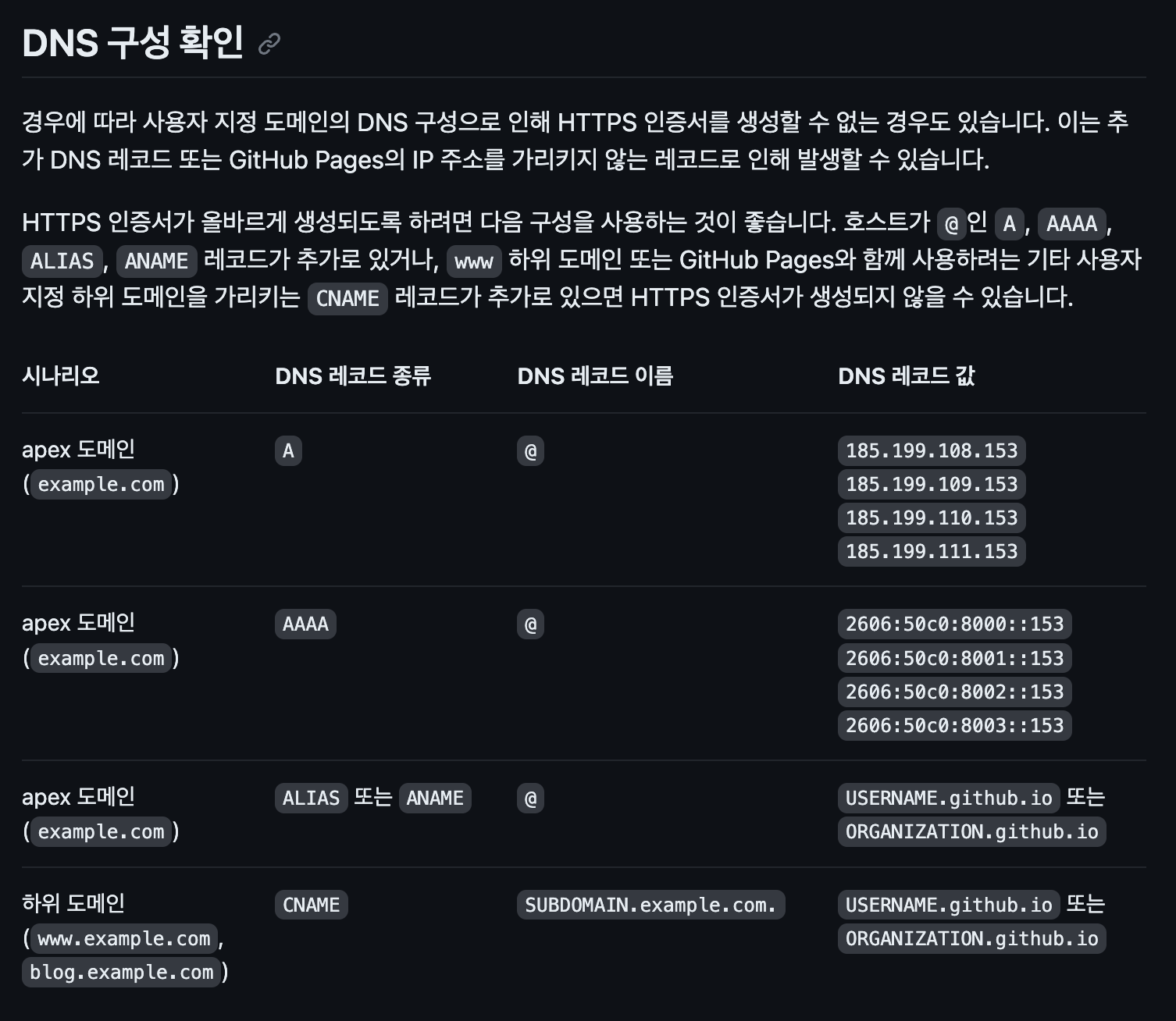 다음 문서를 살펴보면 https 관련 트래픽 설정을 위해서 github pages의 IP를 바라볼 수 있게 가비아에서 DNS 레코드 설정을 해줘야 한다.