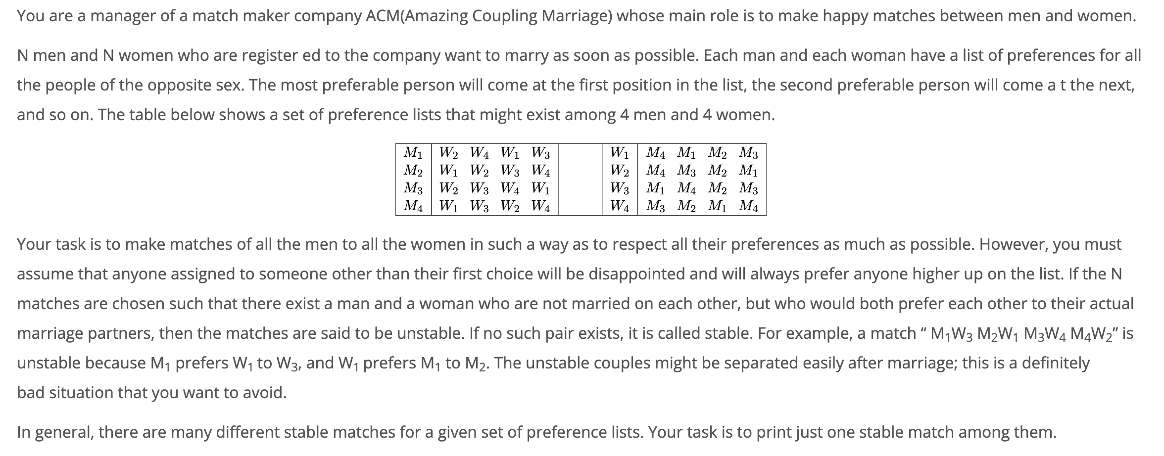남자와 여자의 수가 n명으로 일치하고, 서로의 선호도를 리스트로 받기 때문에 gale-shapley 알고리즘으로 풀이할 수 있다.