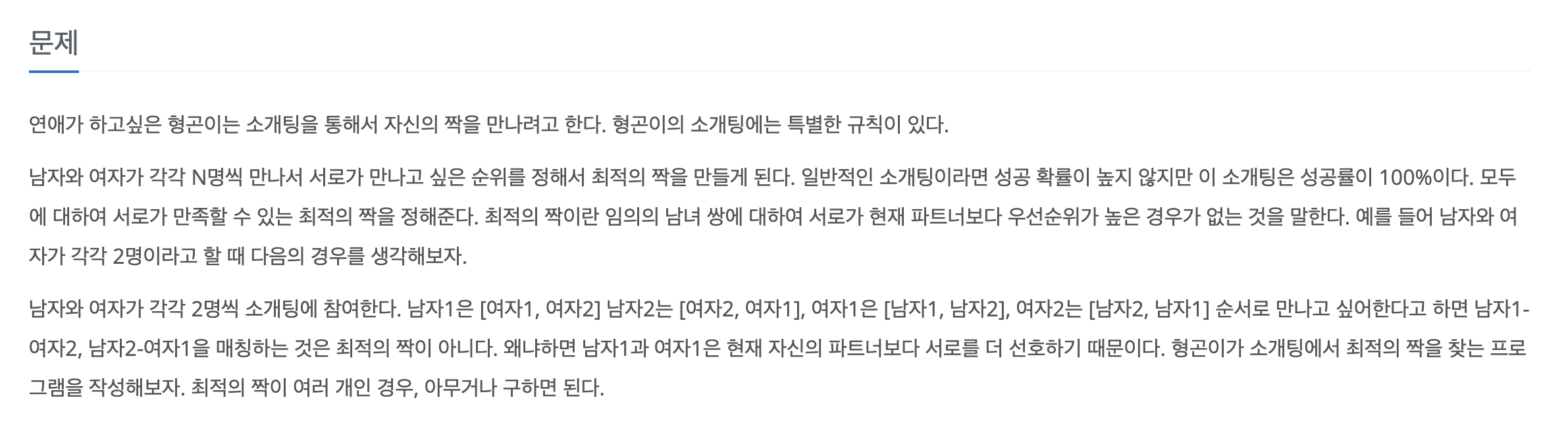 gale-shapley 알고리즘을 통해 풀이할 수 있다. 파이썬 코드는 아래와 같다.