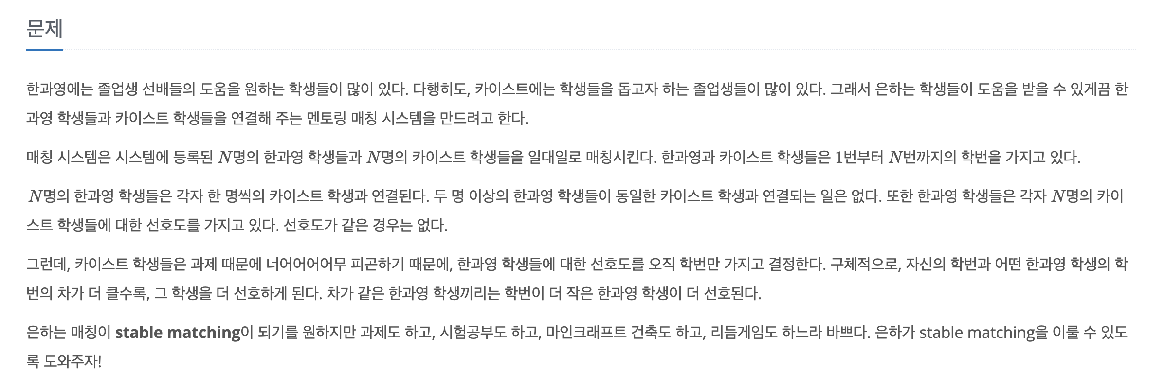 따라서, 저 조건에 맞에 카이스트 학생들의 선호도를 만들어준 후 gale-shapley 알고리즘을 사용하면 풀 수 있다. 필자는 다음과 같이 구현했다.