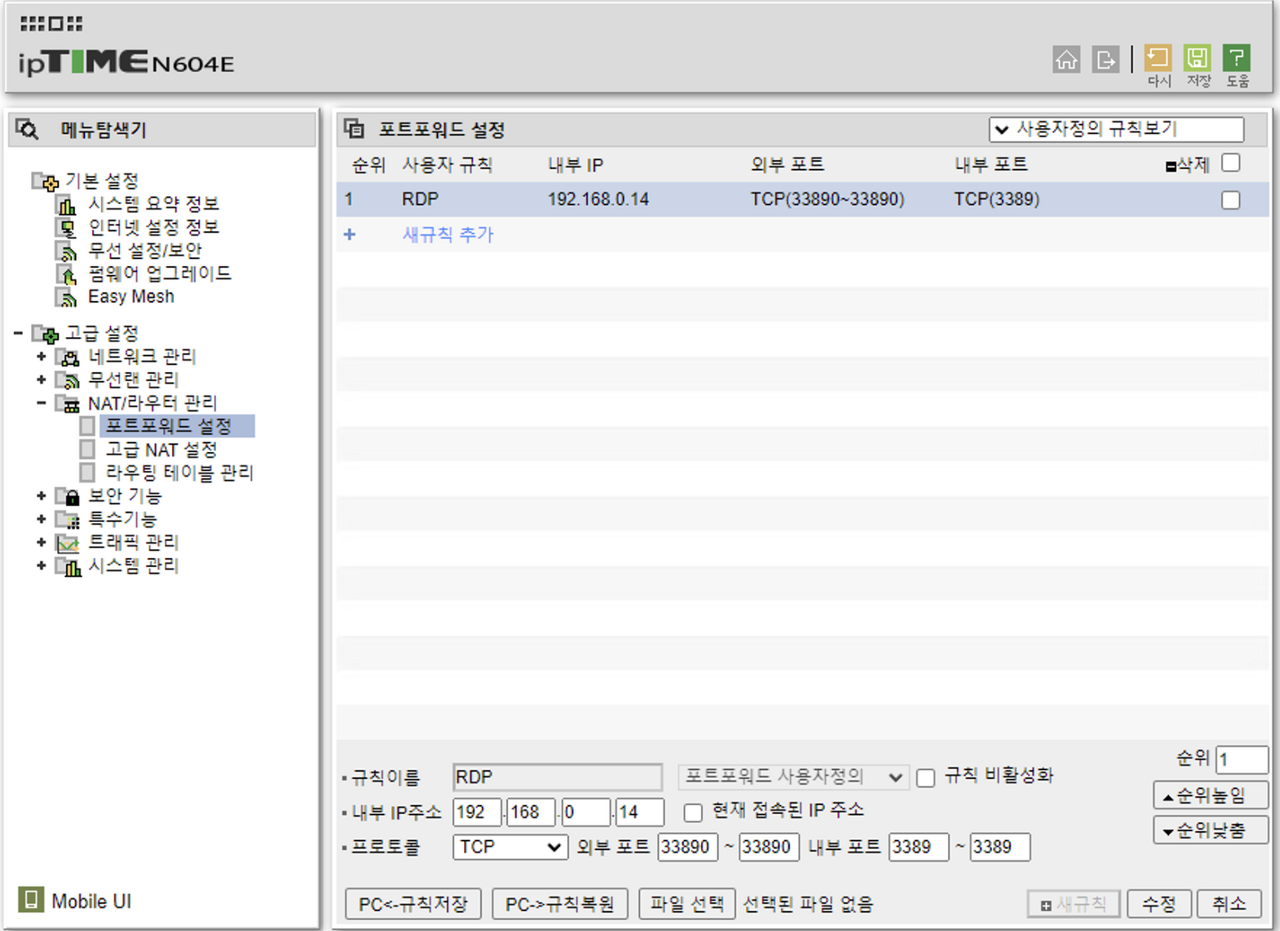 내부 IP주소에 포트포워딩 규칙을 적용하고자 하는 호스트의 사설 IP주소를 입력하고, 내부 포트는 3389로 고정, 외부 포트는 원하는 포트를 입력하면 된다.