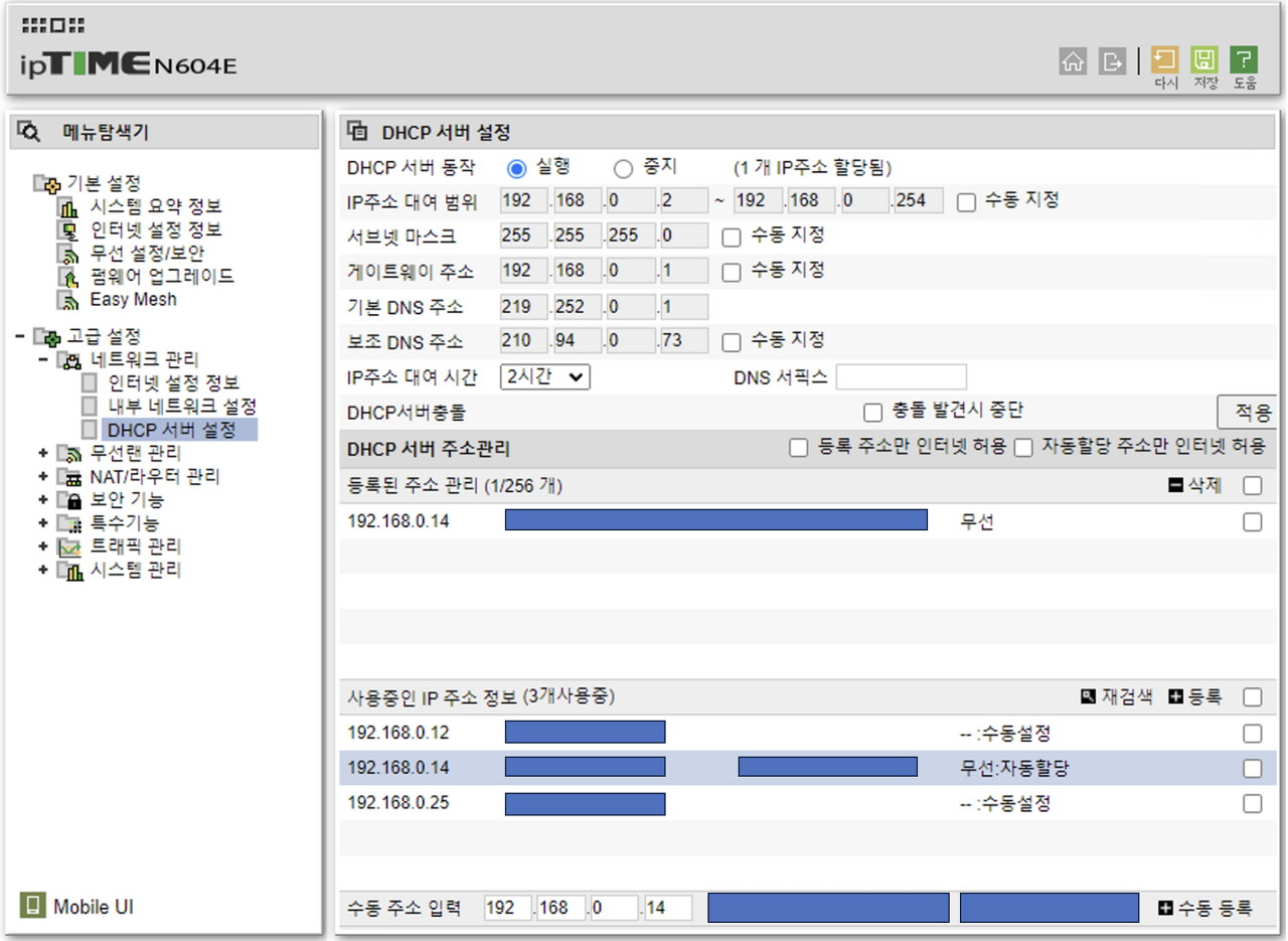 다음으로 고급 설정 - 네트워크 관리 - DHCP 서버 설정 탭으로 이동한다. 아래 부분을 보면 사용중인 IP 주소 정보 탭에 세 개의 사설 IP를 할당받은 Host들을 확인할 수 있다. ( 해당 공유기를 사용 중인 우리 호스트들은 세 개 있다는 뜻이다 ) 원격 접속하고 싶은 host 사설 IP를 클릭하고, 오른쪽 아래 수동 등록 버튼을 누르면 사설 IP를 등록할 수 있게 된다.