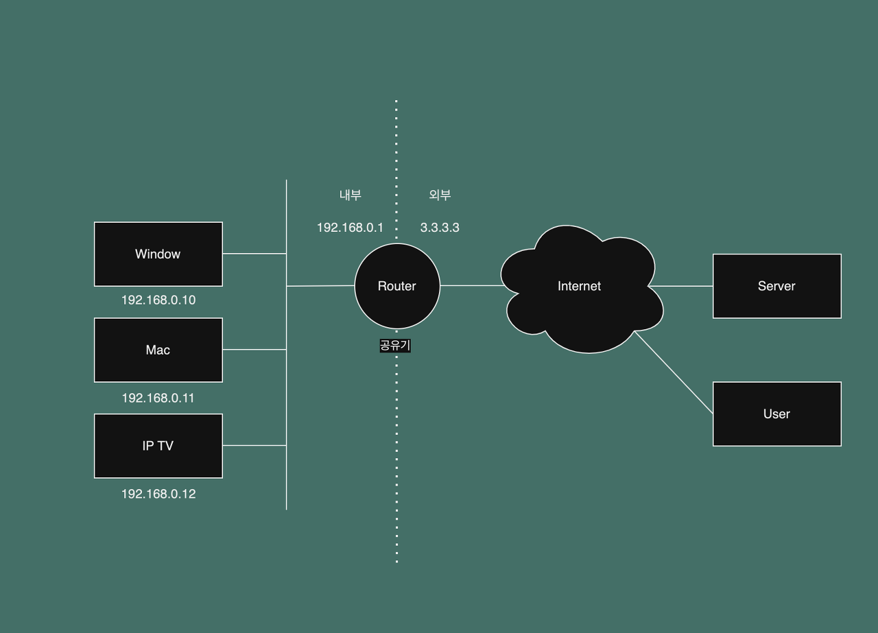 공유기를 사용한다고 가정하고 네트워크의 구조를 위와 같이 그릴 수 있다. Router의 왼쪽은 가정에서 사용하는 와이파이 공유기에 window, mac, iptv 등이 연결되어 있다. 오른쪽은 인터넷으로 연결되어 있고, 외부에는 서버 및 원격 접속을 시도할 유저가 있는 상황이다.