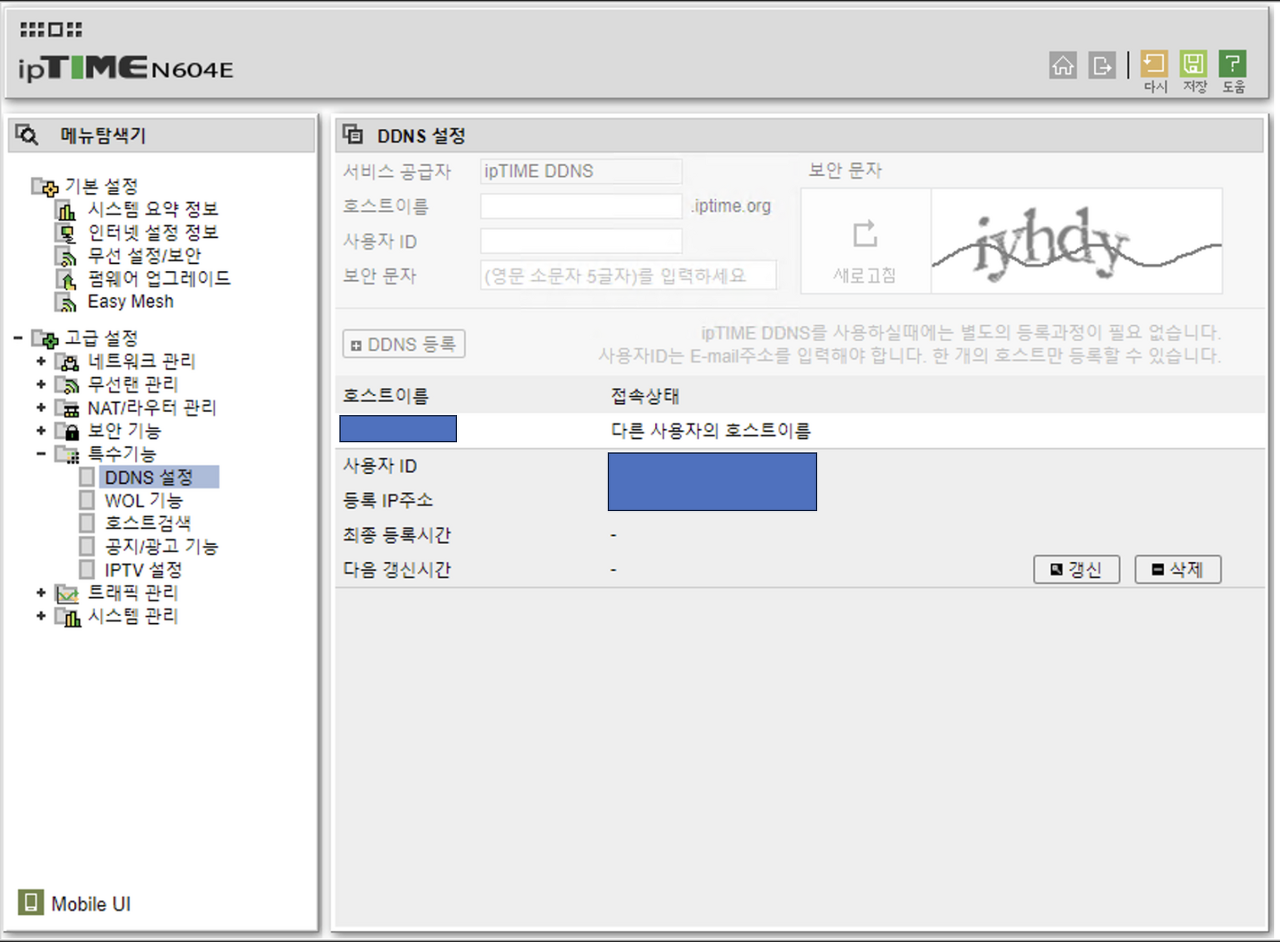 관리 도구를 통해 네트워크 관리 페이지에 들어오면 먼저 고급 설정 - 특수기능 - DDNS 설정 탭에서 DDNS를 등록한다.