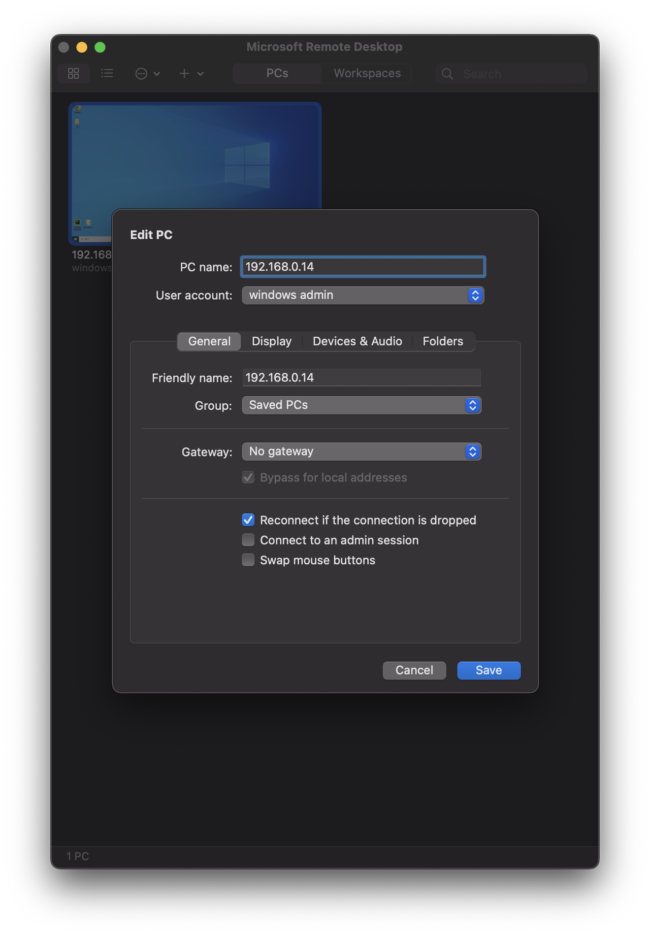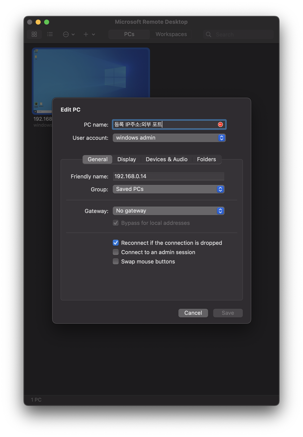 PC name 항목에는 앞서 cmd에서 확인한 IPv4를 입력하여 원격 접속할 수 있다.