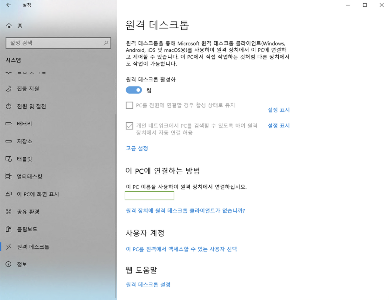 여기서 시스템 - 원격 데스크탑 섹션에 들어가 원격 데스크톱 활성화를 해준다.