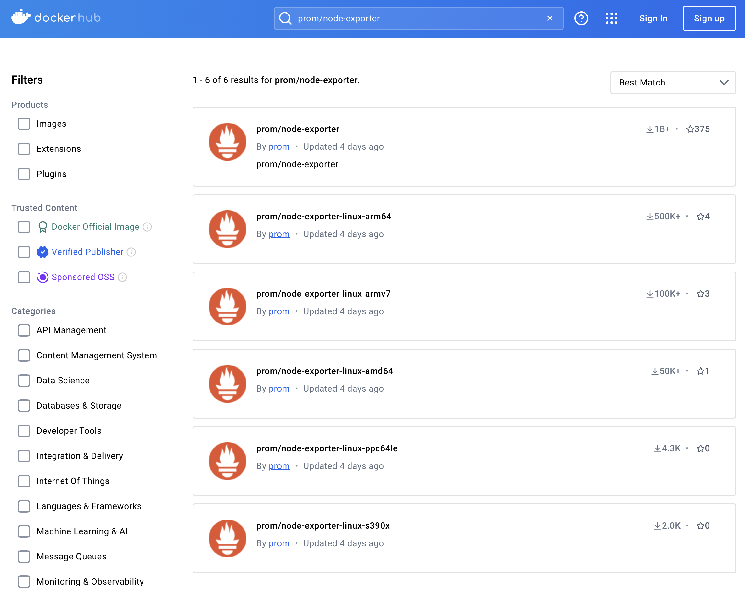 먼저 node-exporter들을 dockerhub에서 찾아보면 다음과 같은 exporter들이 있다. 여기서 prom/node-exporter를 사용해서 노드들의 매트릭을 분출시키는 것들을 살펴보자.