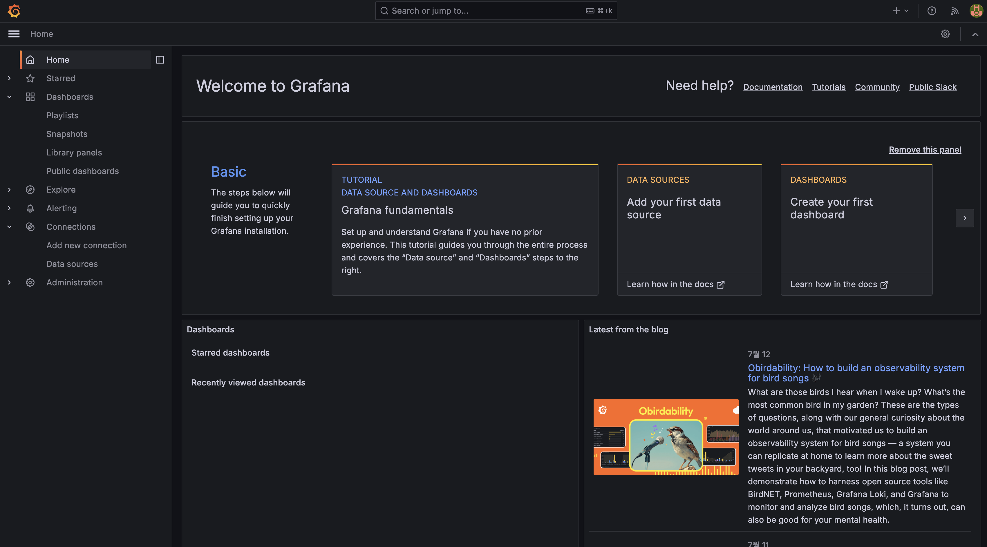 우리는 대시보드를 만들 것이기 때문에 localhost:3000에서 그라파나 대시보드를 확인해 보자.