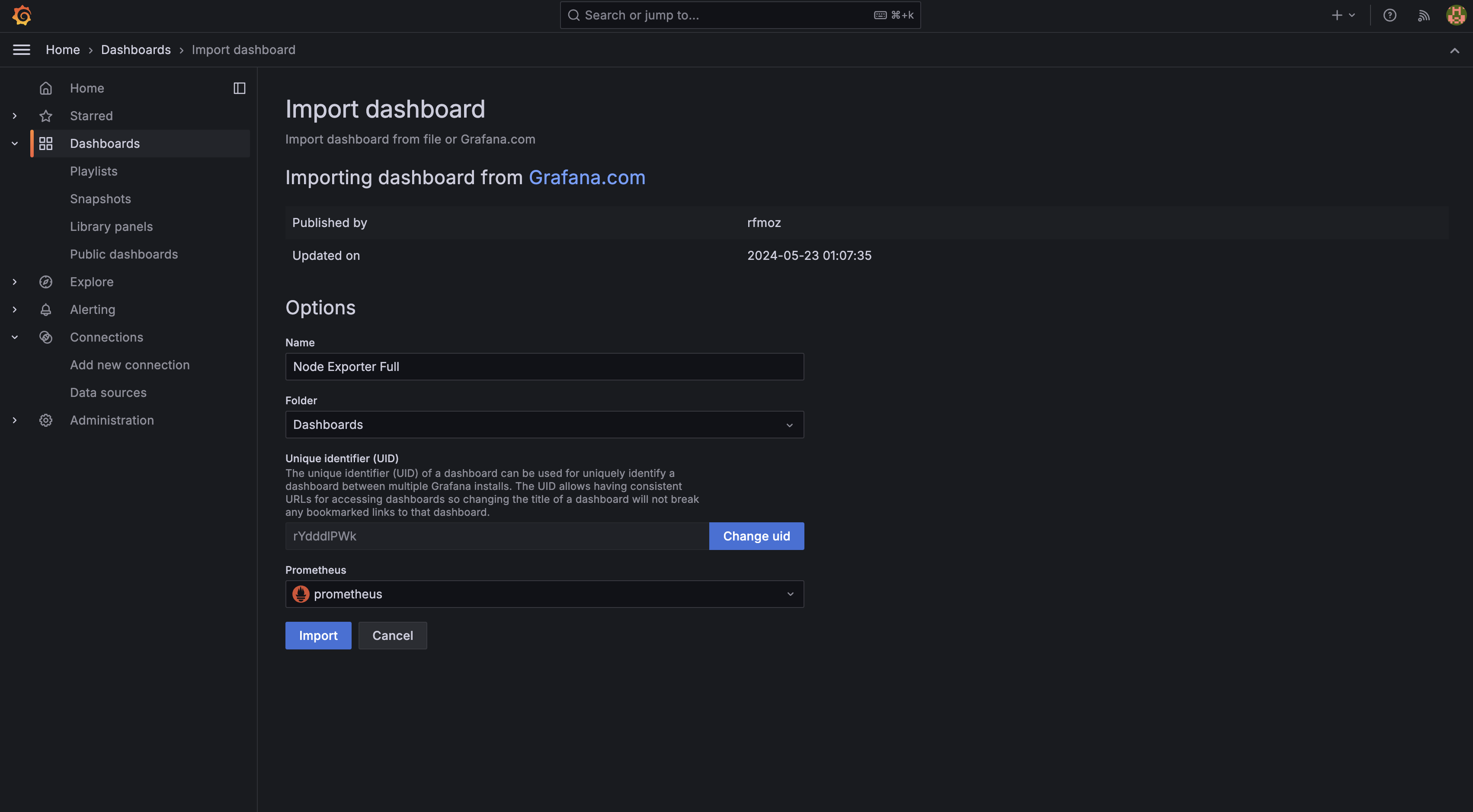 이제 여기서 import를 눌러주면 대시보드를 확인할 수 있다.