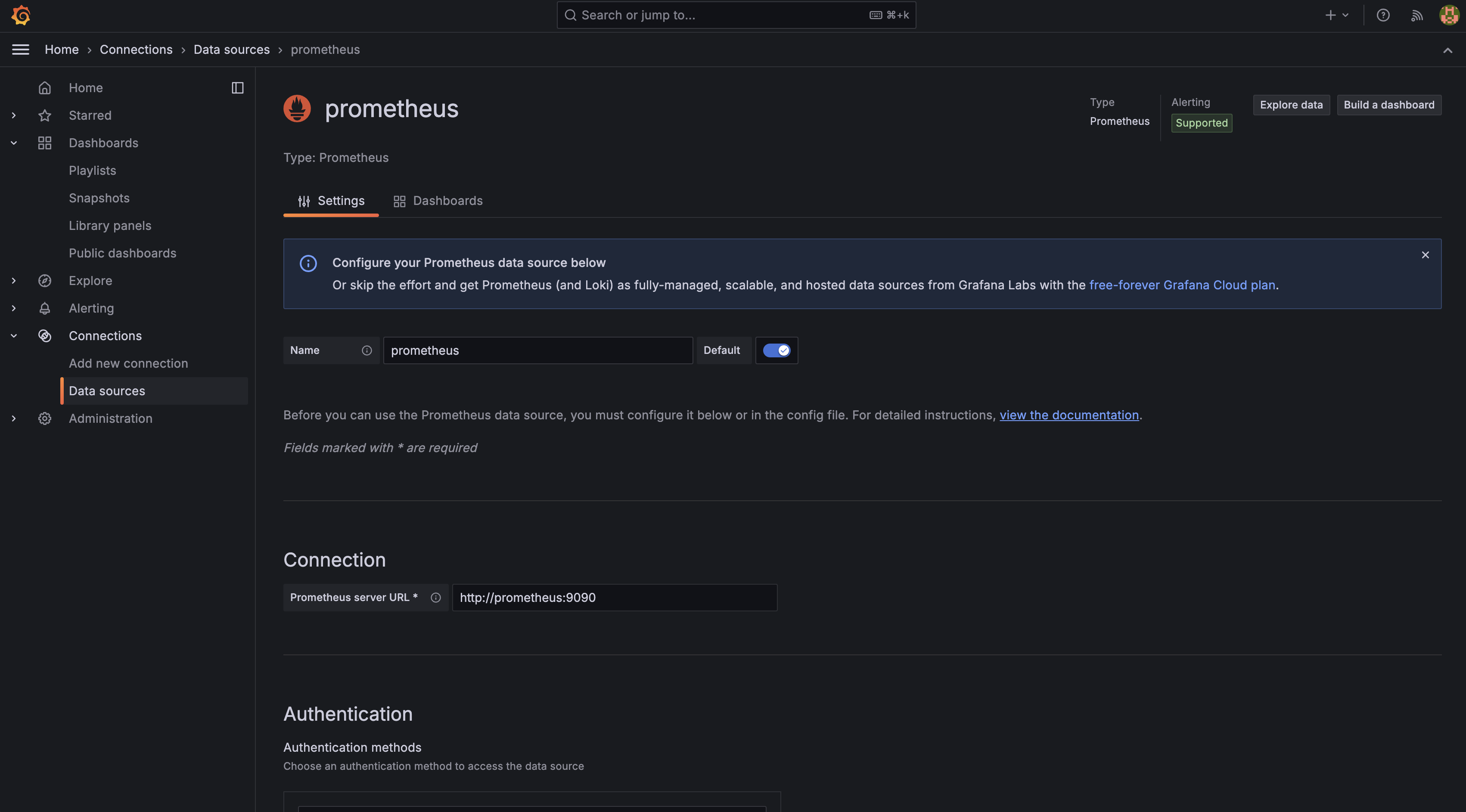 이제 여기서 먼저 prometheus를 연결해줘야 한다. 왼쪽의 Connections - Data source를 통해서 prometheus를 연결한다.