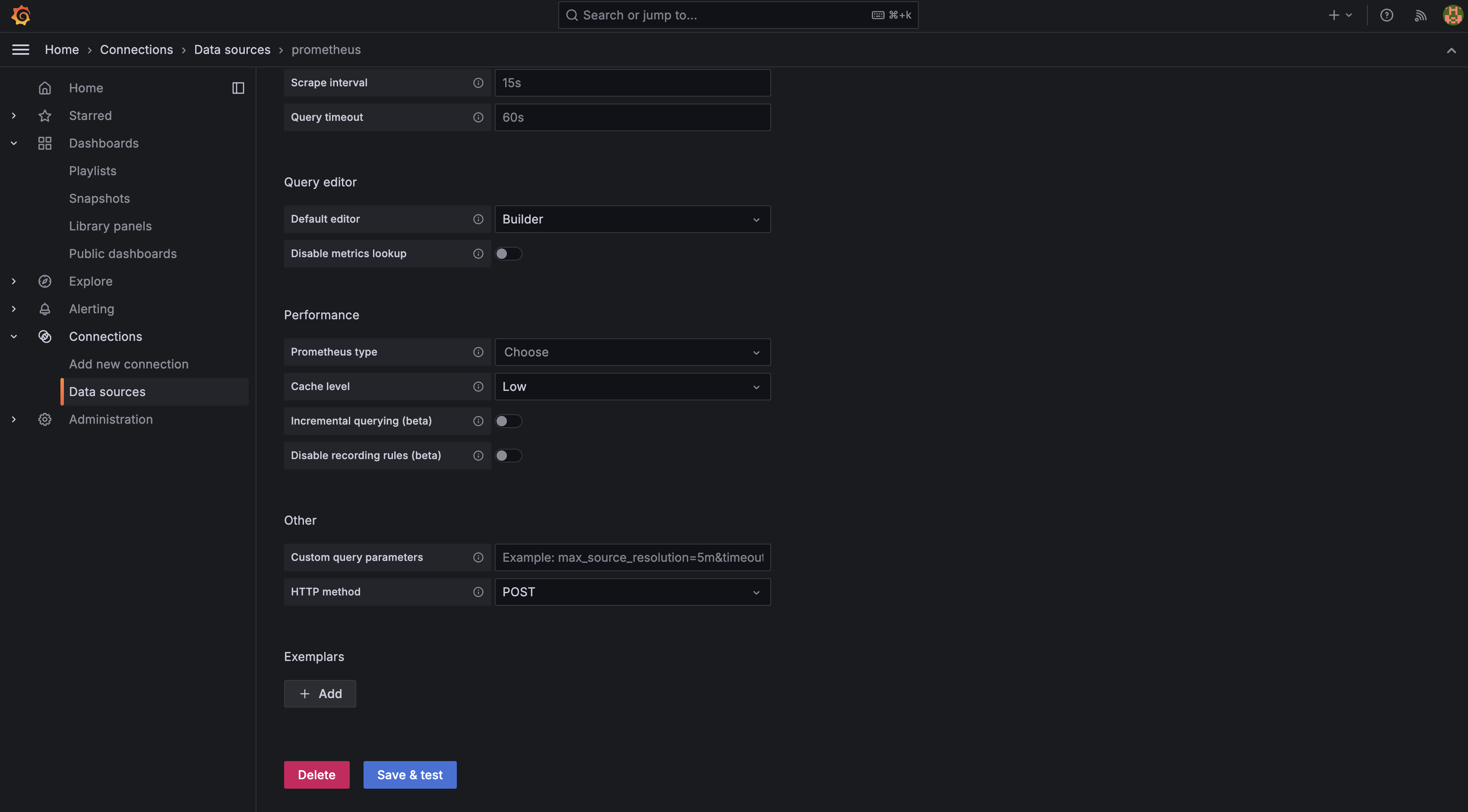 여기서 중요한 포인트는 grafana와 prometheus는 컨테이너로 떠있는 상황이고, docker-compose를 통해 돌아가고 있다는 점이다. 따라서 두 컨테이너 간의 통신을 위해 url을 달아줄 때, http://{docker-compose.yml에 적은 services 명}:9090으로 Connection에 적어줘야 한다는 점이다.