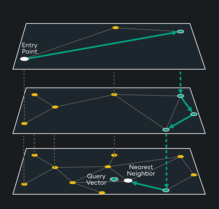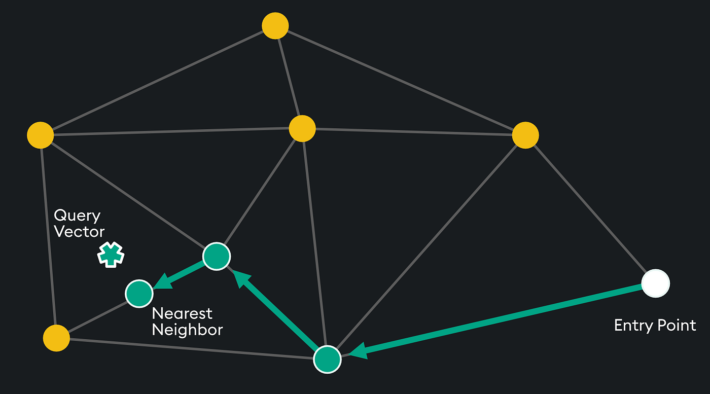 최상위 레이어는 가장 긴 거리를 가지지만 가장 높은 차수의 정점을 포함하고, 점점 내려가면서 더 많은 노드들을 탐색할 수 있도록 하게 한다. 이 탐색방법(HNSW)은 쿼리 벡터와 가장 가까운 이웃의 거리가 로컬 최소값에 도달할 때까지 계속되는 방법이다.