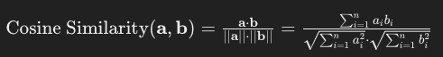 코사인 유사도는 두 벡터 간의 각도를 기반으로 유사성을 측정한다. 벡터의 크기보다는 방향이 얼마나 유사한지를 평가하는 방법이다.