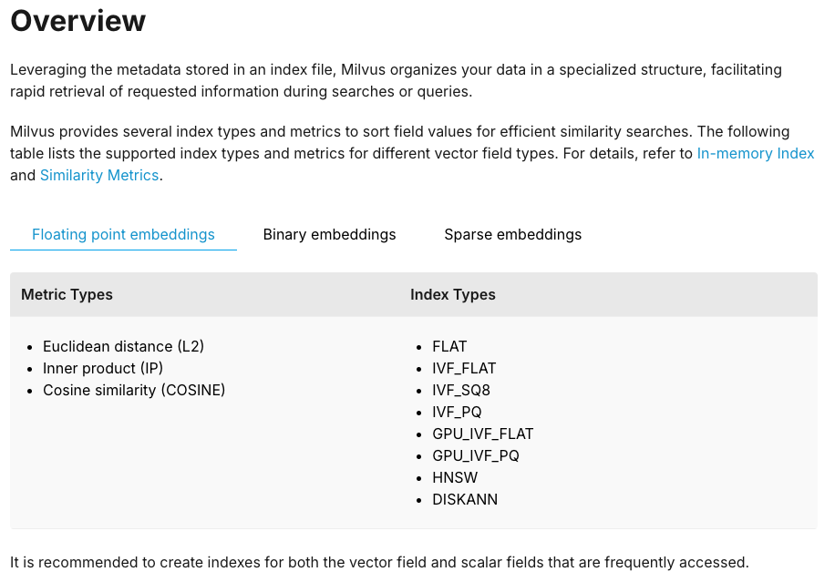 앞서 다양한 인덱싱 방법과 거리 측정 방법에 대해서 알아보았다. 이러한 수많은 방법들에 대해서 개괄적으로 서술하기만한 이유는 이미 대부분의 서비스들이 이미 구현되어있는 오픈소스들이 많기 때문이다. 다음은 milvus라고 불리는 VDB의 공식 문서이다