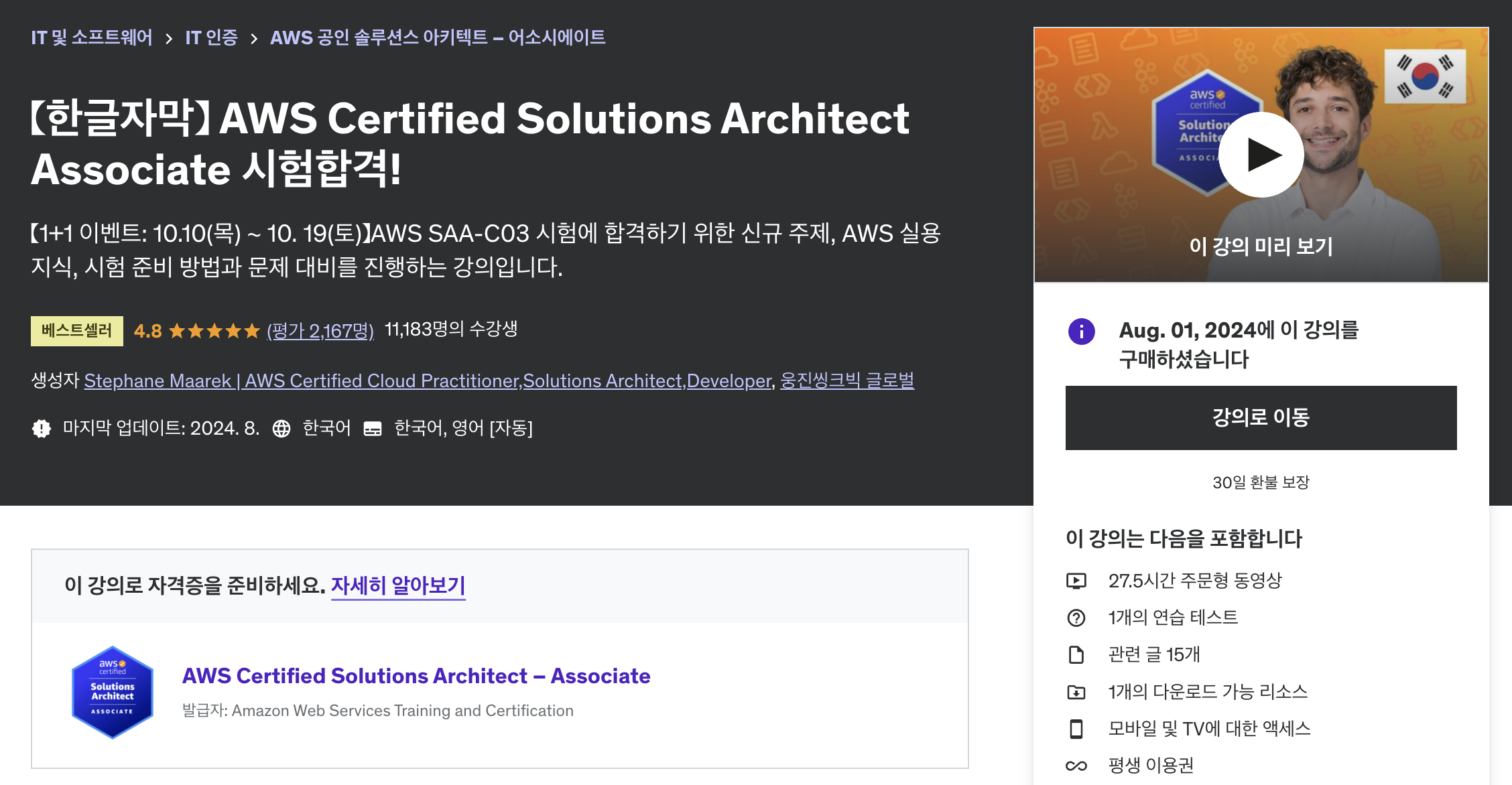 강의에 대한 설명을 하자면, 강의는 총 27.5시간이고 한 강의당 10분 이내이고 짧으면 1분짜리 강의도 있다. 총 426개의 강의로 섹션 별로 다양하게 AWS의 거의 모든 서비스를 소개해준다. 우리가 흔하게 아는 S3, EC2는 물론이고 RDS의 다양한 버전들에 대해서 설명해 준다. 위 강의의 특징은 이론뿐만이 아니라 실습으로 소개해주는데, 어느 정도의 AWS 경험이 있기 때문에 실습을 굳이 하지는 않았고 눈으로 따라서 보기만 했던 것 같다.