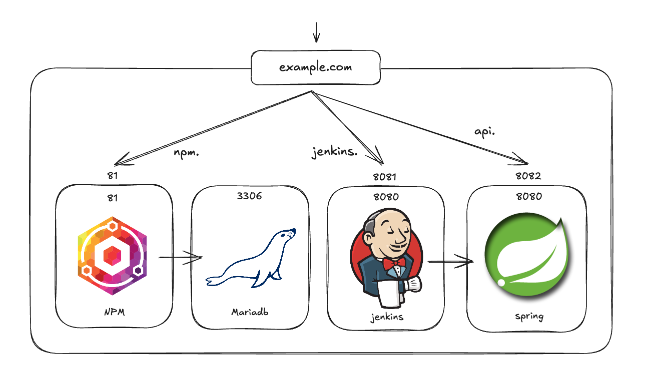 이 과정에 앞서, nginx proxy manager라는 도구를 통해서 서버로 들어오는 트래픽을 다양하게 분산시키는 구성으로 만들면 아래와 같다.