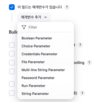 그 후 위와 같은 페이지를 볼 수 있을 텐데, 설명에 맞게 적당히 필요한 옵션을 클릭한다. CI/CD 단계에서 가장 중요한 옵션은 이 빌드는 매개변수가 있습니다 섹션이다. 다양한 타입의 매개 변수를 입력할 수 있는 데, 아래와 같은 파라미터들이 있다. 이렇게 직접 젠킨스에서 집어넣은 매개변수(파라미터)를 사용할 수 있다.