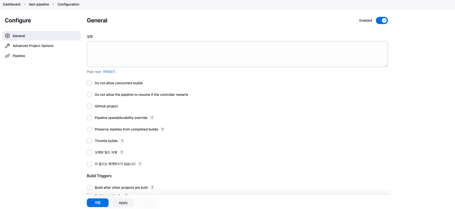 여기서 왼측의 새로운 item을 통해서 파이프라인을 생성할 수 있다.