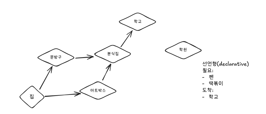 선언형 프로그래밍(Declarative Programming)은 프로그램이 무엇을 해야 하는 지를 기술하는 프로그래밍 패러다임을 의미한다. 즉 실행 방법보다는 결과만 적어두고, 빌드의 프로세스 등은 빌드 툴에 의지하게 되는 것이다. 위와 같이 필요한 것과 도착한 것을 적어두면 프로그램은 알아서 위 조건을 지켜서 알고리즘에 따라 학교에 도착하는 것이다. 위와 비교해 보면 훨씬 간편한 것을 알 수 있고, 만약 선언형으로 설정할 것이 훨씬 많다면, 그만큼 경우의 수가 늘어나기 때문에 몇 배로 편해질 것이다.