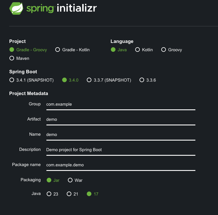 자바를 공부하는 단계라면 단순히 위와 같은 간단한 설정을 통해서 프로젝트를 세팅하고, 스프링 Data JPA나 스프링 시큐리티 등 다양한 의존성을 추가해서 스프링 프로젝트를 .zip 형태로 받아볼 수 있다.