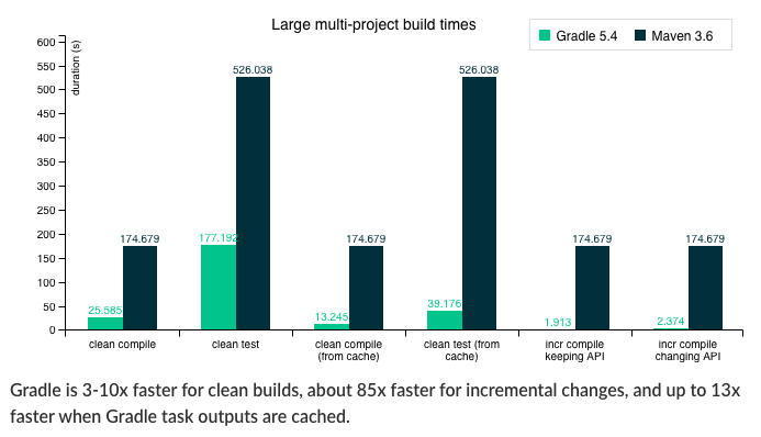 Maven의 단점인 속도를 개선한 병렬 방식의 빌드와 빌드 캐싱(gradle cache)을 통해서 빠른 빌드 속도를 제공한다.추가로 Incremental builds라는 방식을 사용하는 데, 이로 인해 Maven에 비해 최대 85배의 압도적인 성능이 나오는 것을 확인할 수 있다. 관련된 레퍼런스를 첨부한다.