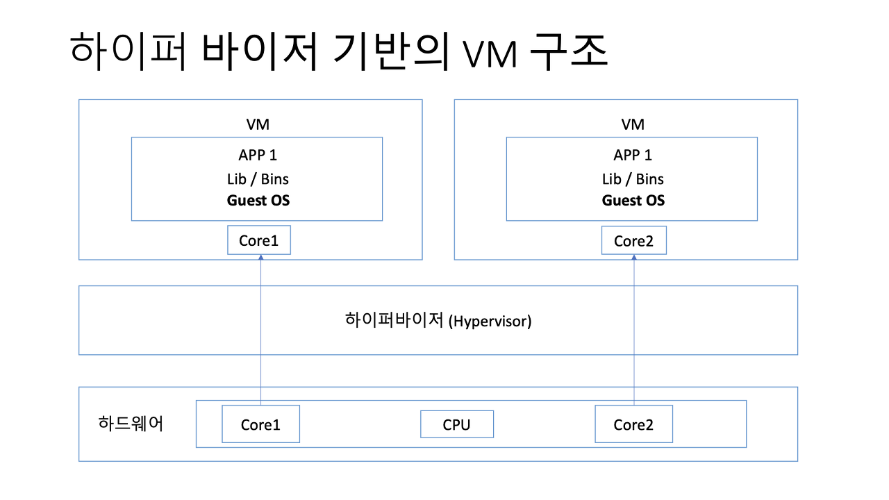 자, 하이퍼바이저 기반의 VM 구조는 위 사진과 같은데, 그림과 같이 하드웨어의 일부분을 각 VM에다 할당해주는데, 이때 게스트 OS까지 할당해주게 된다. 하이퍼바이저를 사용하여 개발하는 경우 이러한 구조로 인프라 환경이 갖추어진다.