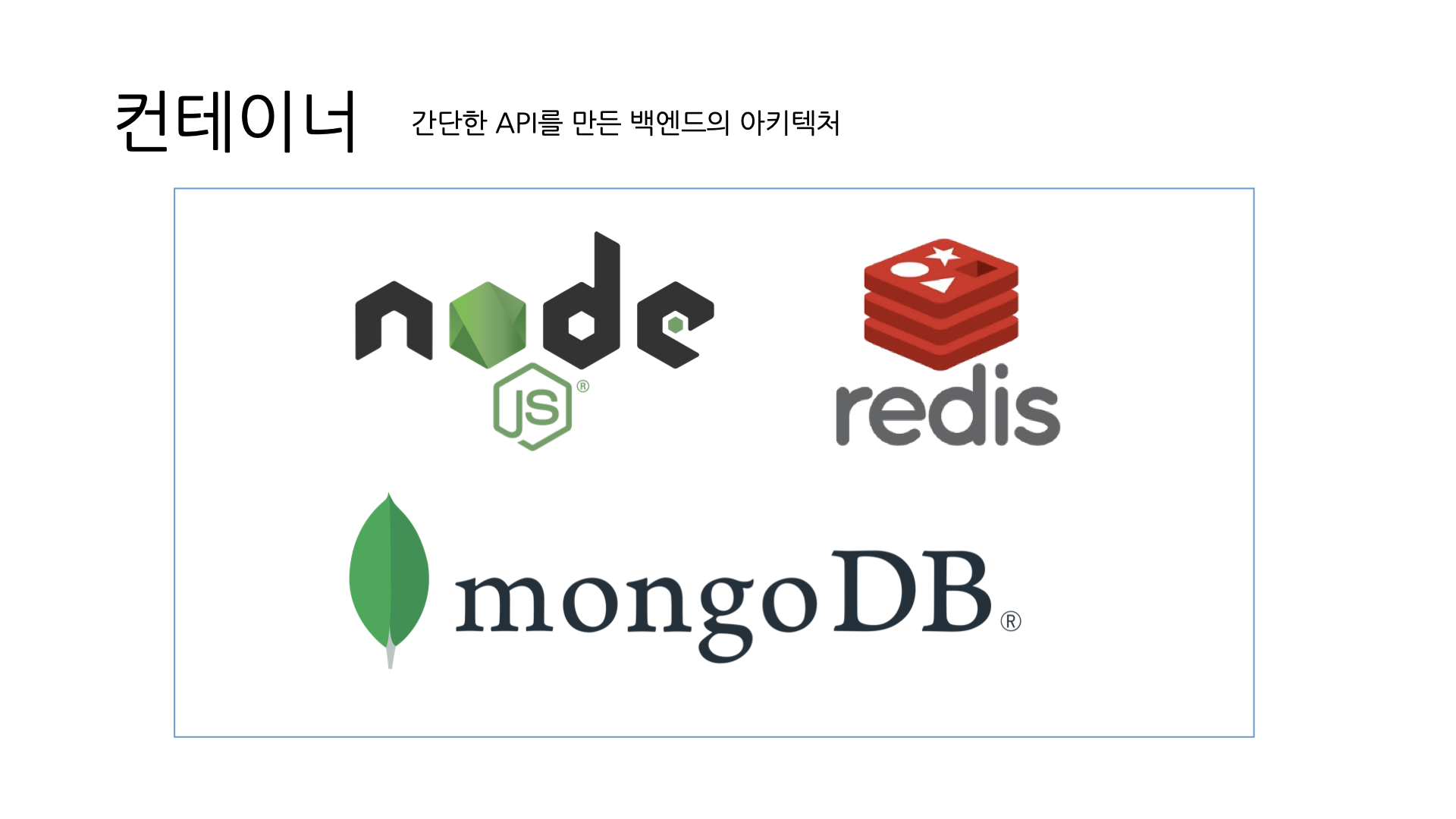 위 사진은 백엔드 아키텍쳐를 node, redis, mongoDB를 사용하여 구성한 것을 보여주는데, 도커를 통해 해당 패키지들의 버전을 명시하고, 각 프로그램들이 돌아가는 환경을 할당함으로서 좀 더 효율적으로 서버 환경을 구성할 수 있게 한다.
