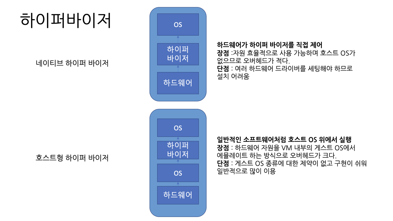 - 리소스 오버헤드 : 하드웨어와 VM에 중간 계층이 존재하여 리소스가 다른 부분에 쓰이게 된다.