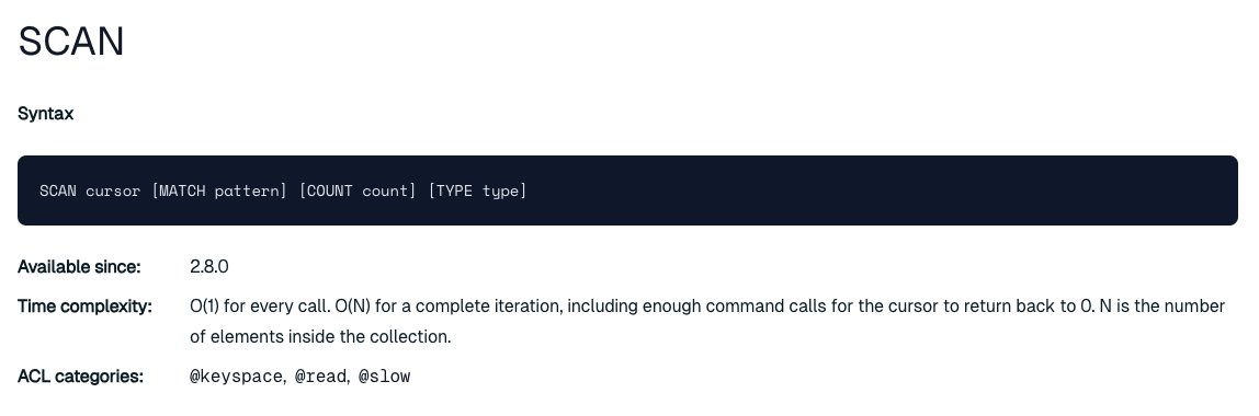 또한 탐색에 대해서는 keys *를 사용해 볼 수도 있고, scan 명령어를 사용해 볼 수도 있다. 이에 대해서는 각각의 장단점이 존재하기 때문에 어떤 명령어를 사용하더라도 자세히 살펴보면서 신중하게 시간복잡도를 측정하는 것이 중요하다.