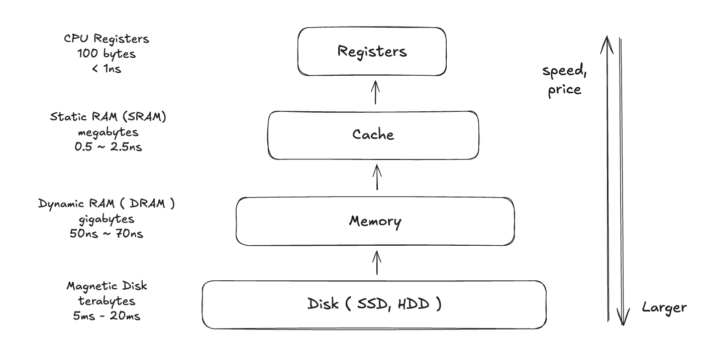 어느 정도 알고있는 내용이지만 정확히 얼마나 빠르지?에 대해서 궁금하기 때문에 조사와 함께 figure를 그려왔다. 컴퓨터는 CPU라고 부르는 중앙 처리 장치에 의해서 작동된다. 위로 가면 갈수록 CPU에 가까워지기 때문에 빠르게 데이터를 왔다 갔다 움직일 수 있게 된다. 위로 올라갈수록 속도와 가격은 올라가며, 밑으로 내려갈수록 크기는 커진다.