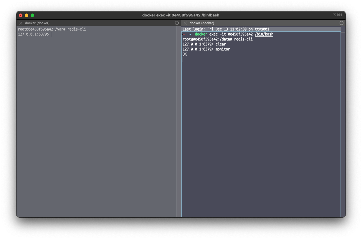 자, 이제 일단 위 과정을 통해서 두 개의 redis-cli를 띄어놓자. 그 후 하나의 redis-cli에서 monitor 명령어를 입력한다.